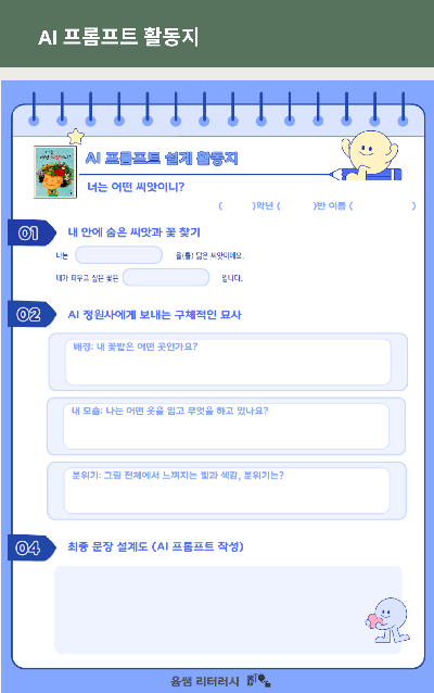 기존에 나눔 했던 종이꽃/북아트 도안에 더해, 수업의 질을 결정짓는 질문 카드, AI 프롬프트 활동지, 그리고 수업 시나리오를 모두 담았습니다.