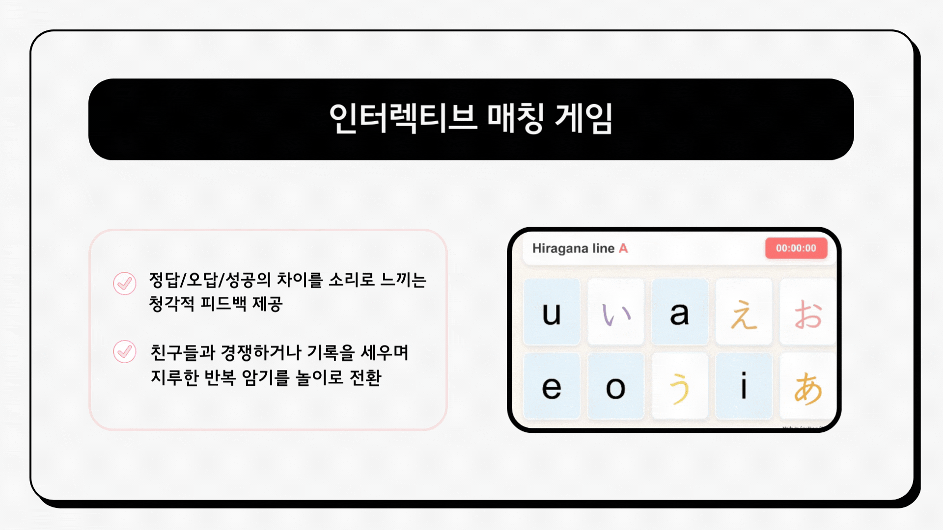 2. 문자/발음 매칭 게임: 지루한 반복 암기를 놀이처럼 즐기며 즉각적인 피드백을 받습니다.