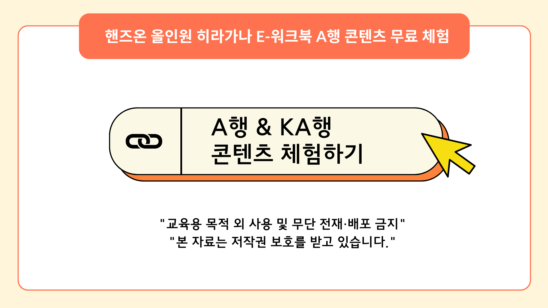 PDF 파일 속 [A행, Ka행 콘텐츠 무료 체험] 버튼을 클릭하시면, 별도의 로그인 없이 바로 스마트 워크북 페이지로 연결됩니다. 지금 바로 클릭해서 혁신적인 수업을 경험해 보세요!