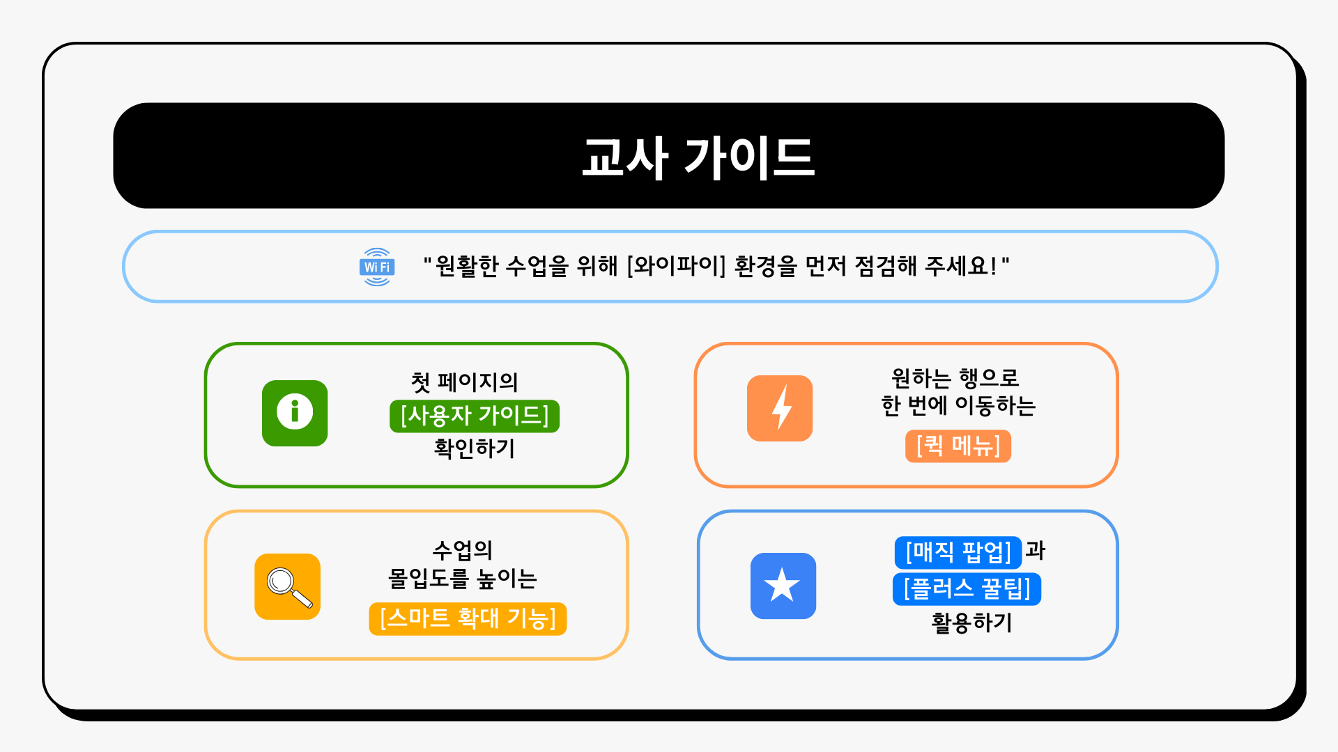 설치도, 로그인도 필요 없습니다!  클릭 한 번이면 교실 전자칠판, 학생 태블릿, 스마트폰 어디서나 최적화된 올인원 학습 시스템이 펼쳐집니다.