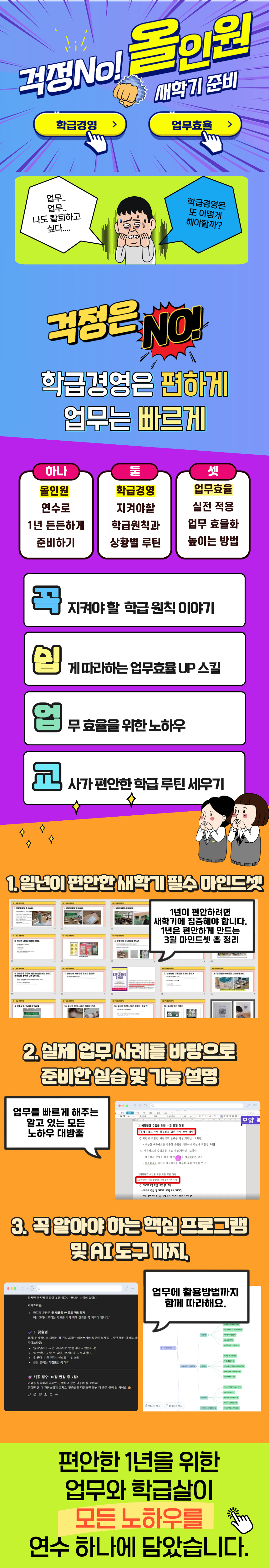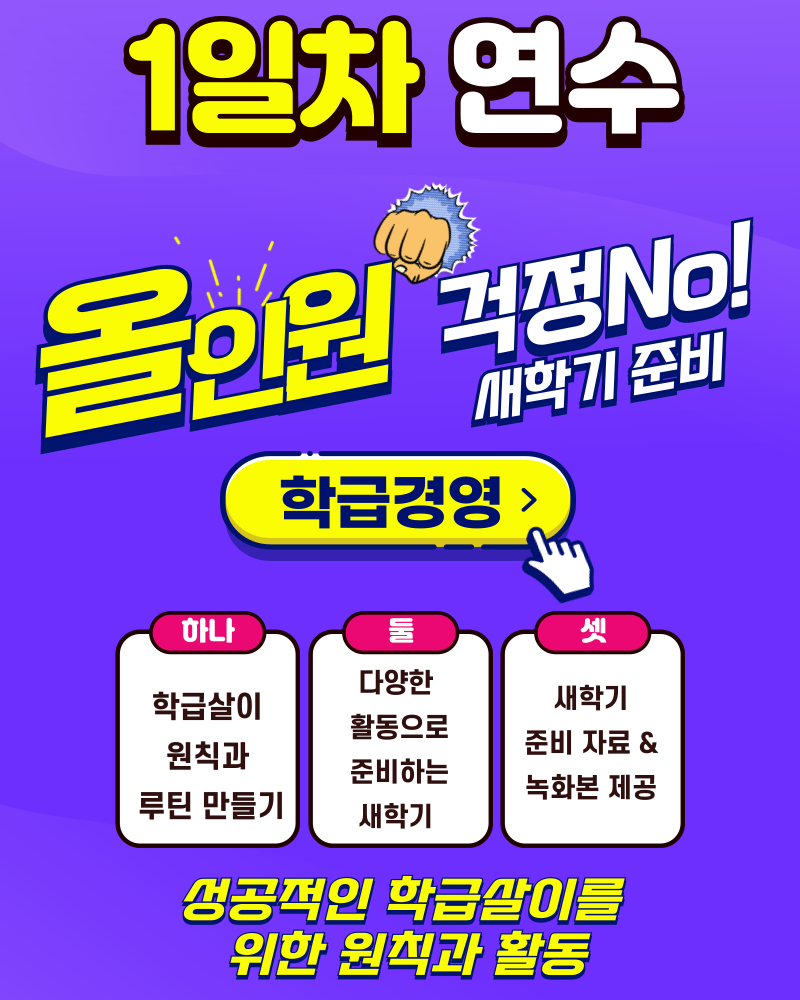 이번 All in one 연수는 1년을 편하게 만들기 위한 학급경영 마인드셋부터 업무 효율화 스킬까지 한 번에 잡을 수 있는 패키지 연수입니다.