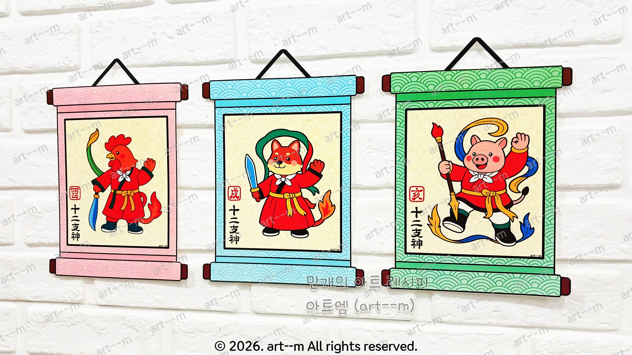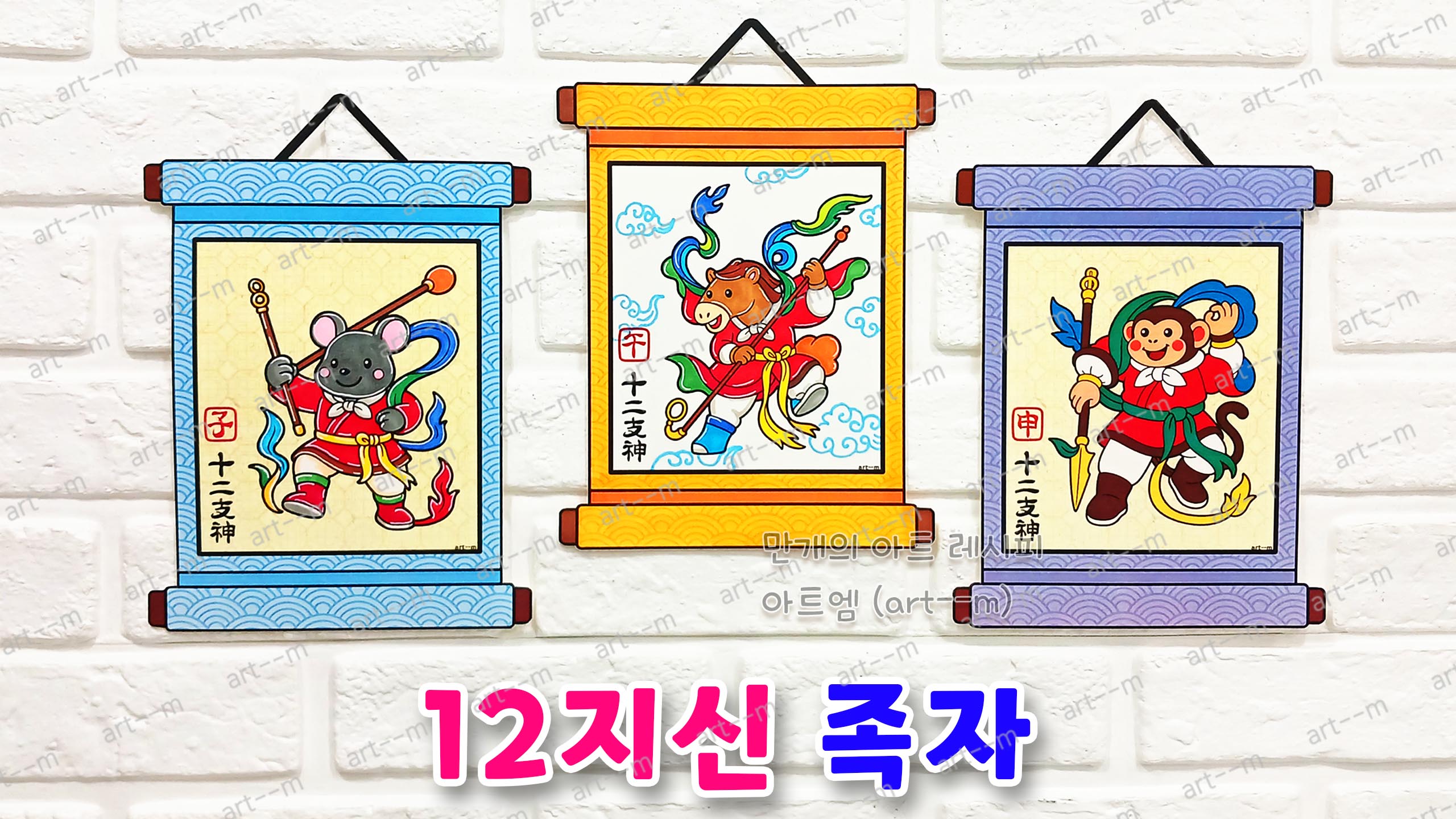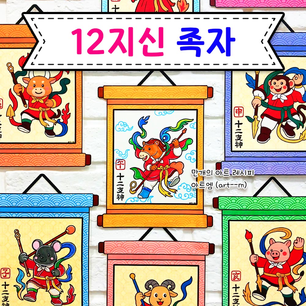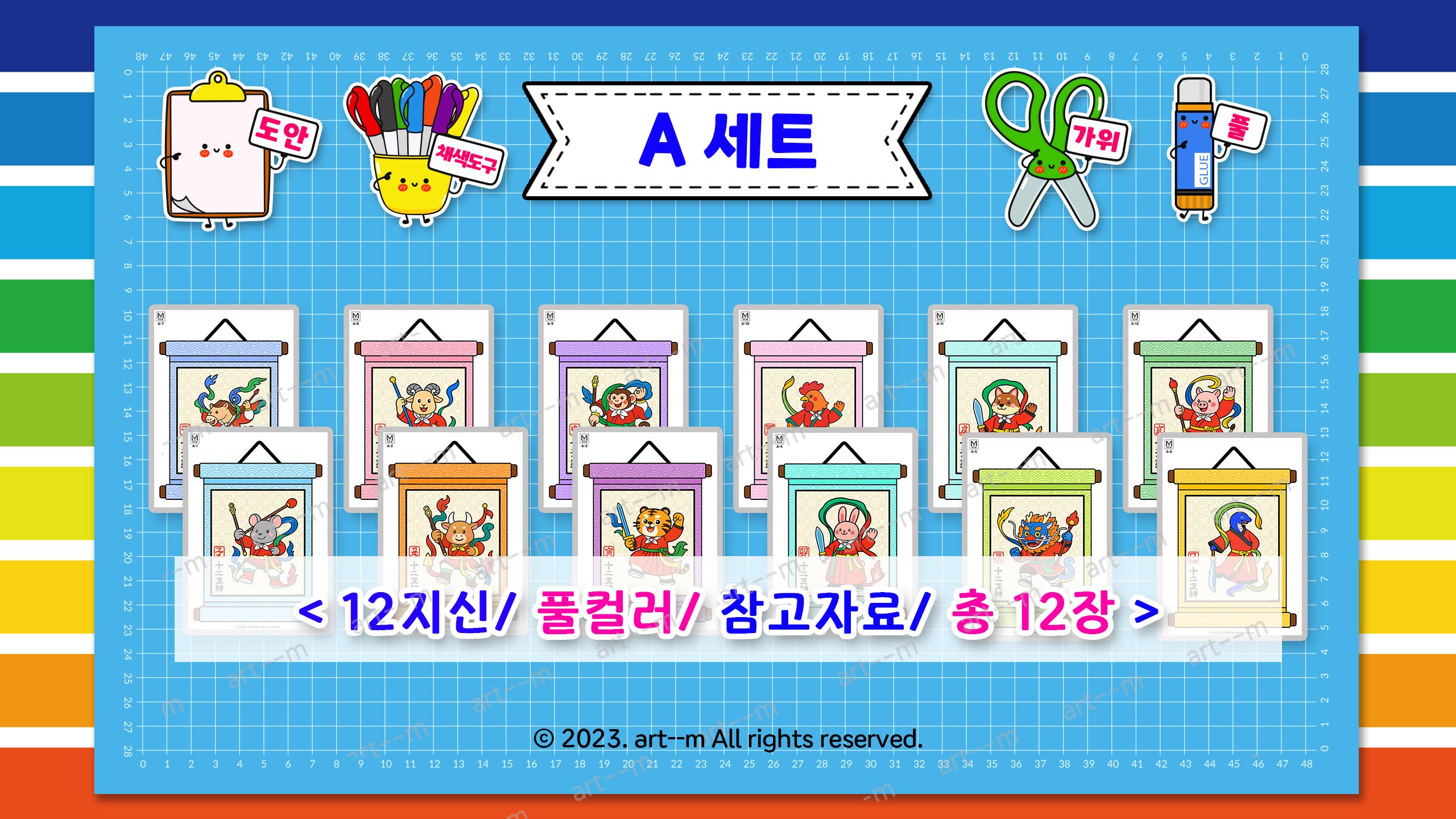 A 세트는 12가지 동물 그림이 있는 12지신 풀 컬러 족자입니다. 색칠도안과 1:1 크기로, 채색에 참고하거나 다양한 전시에 활용할 수 있습니다.
