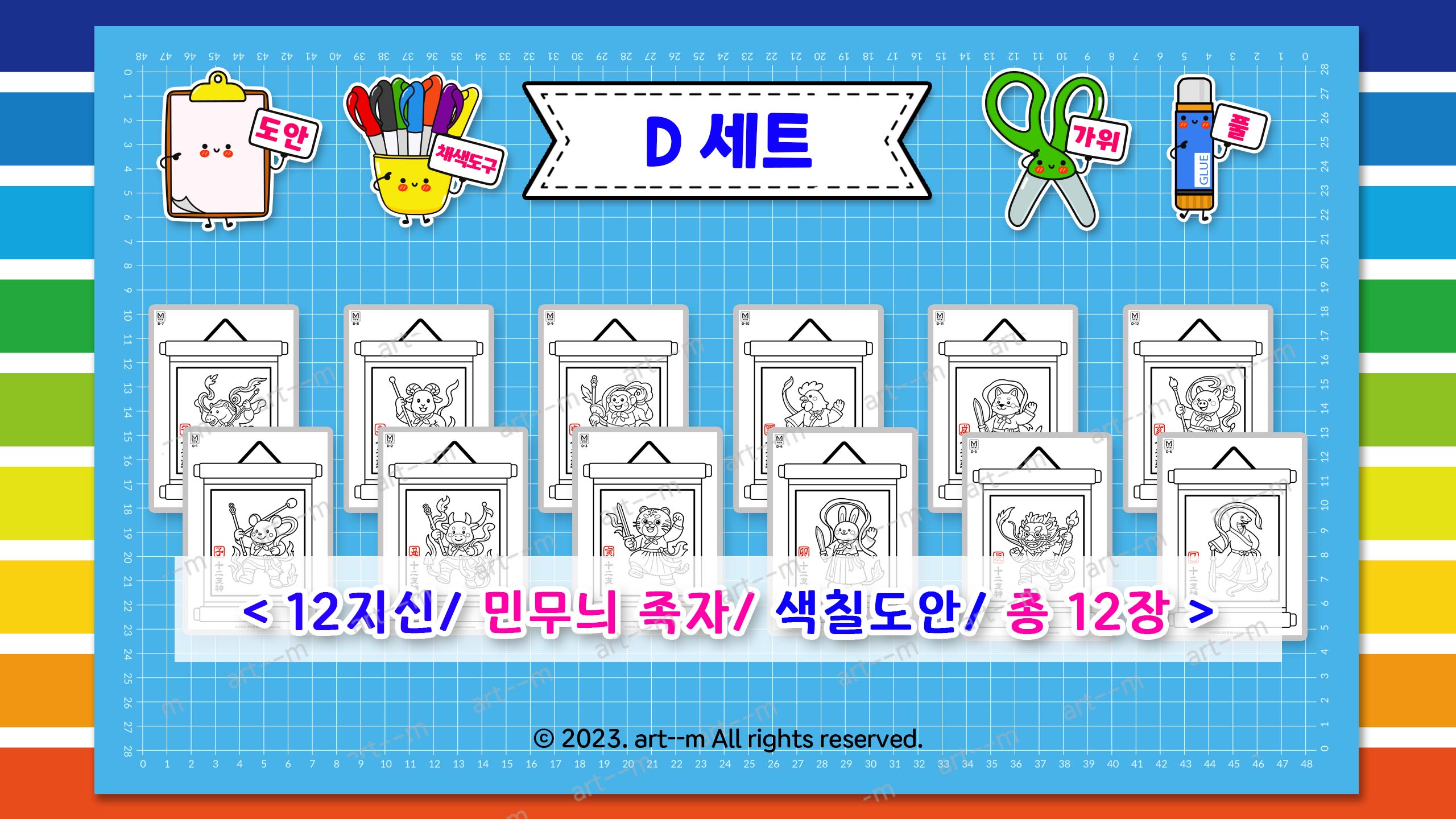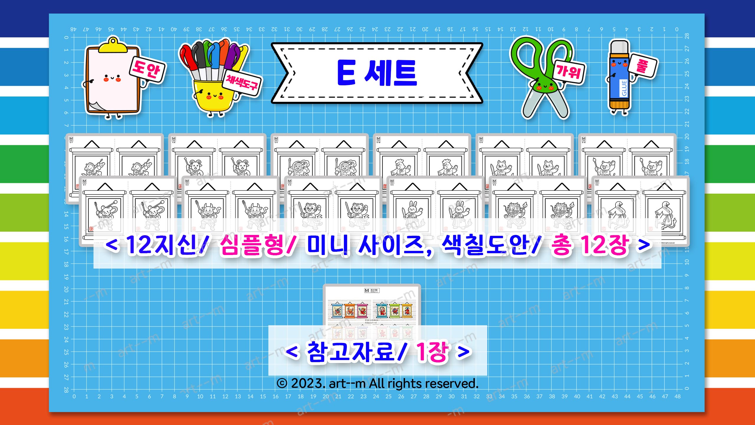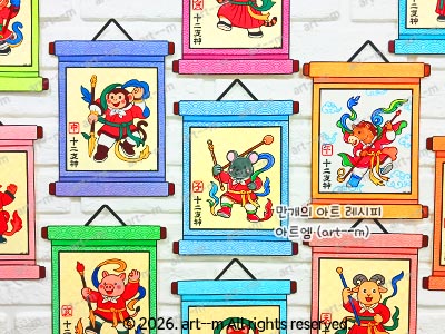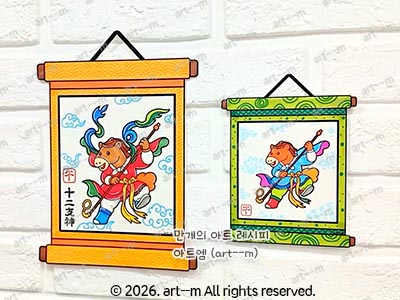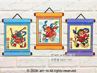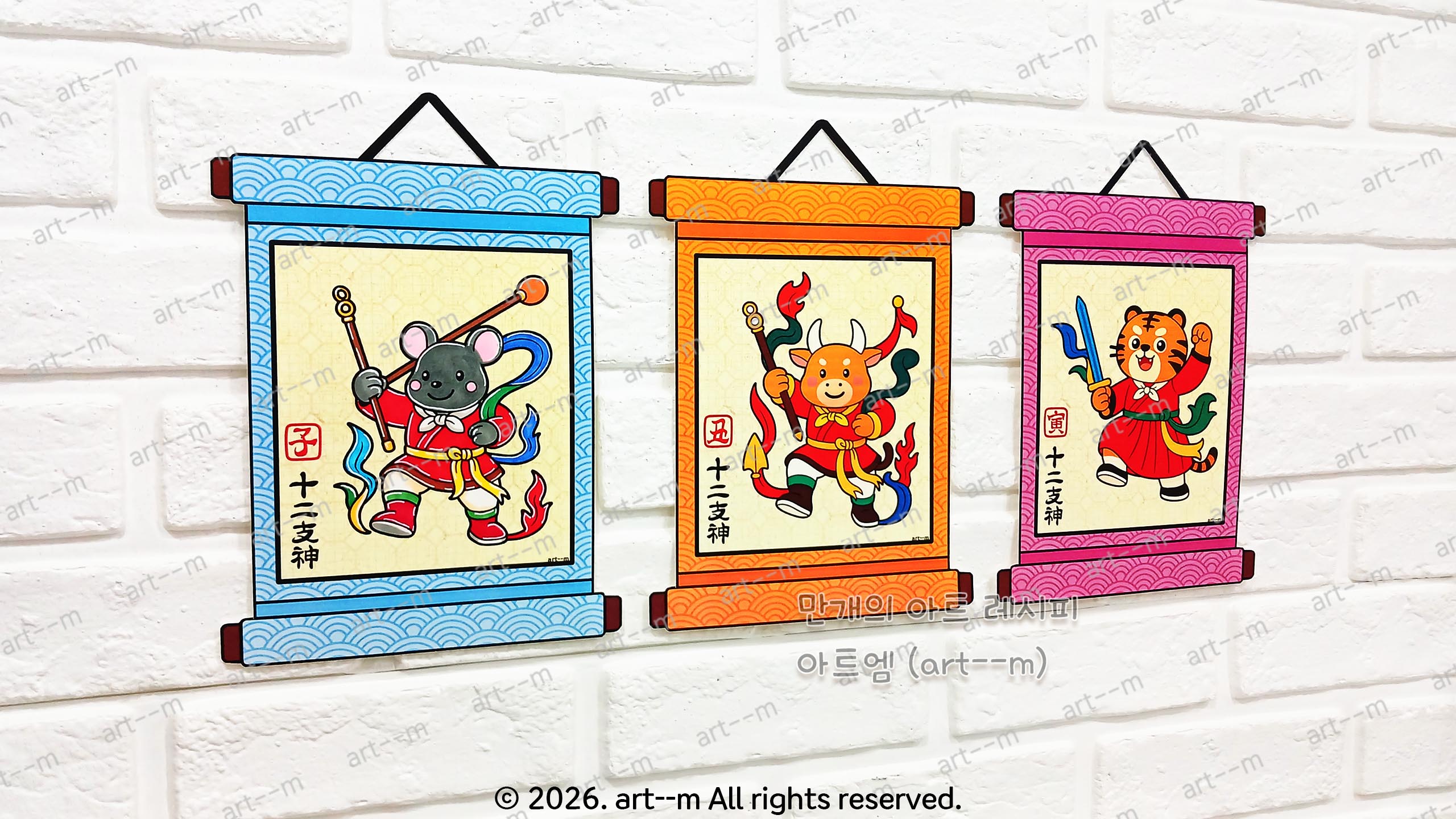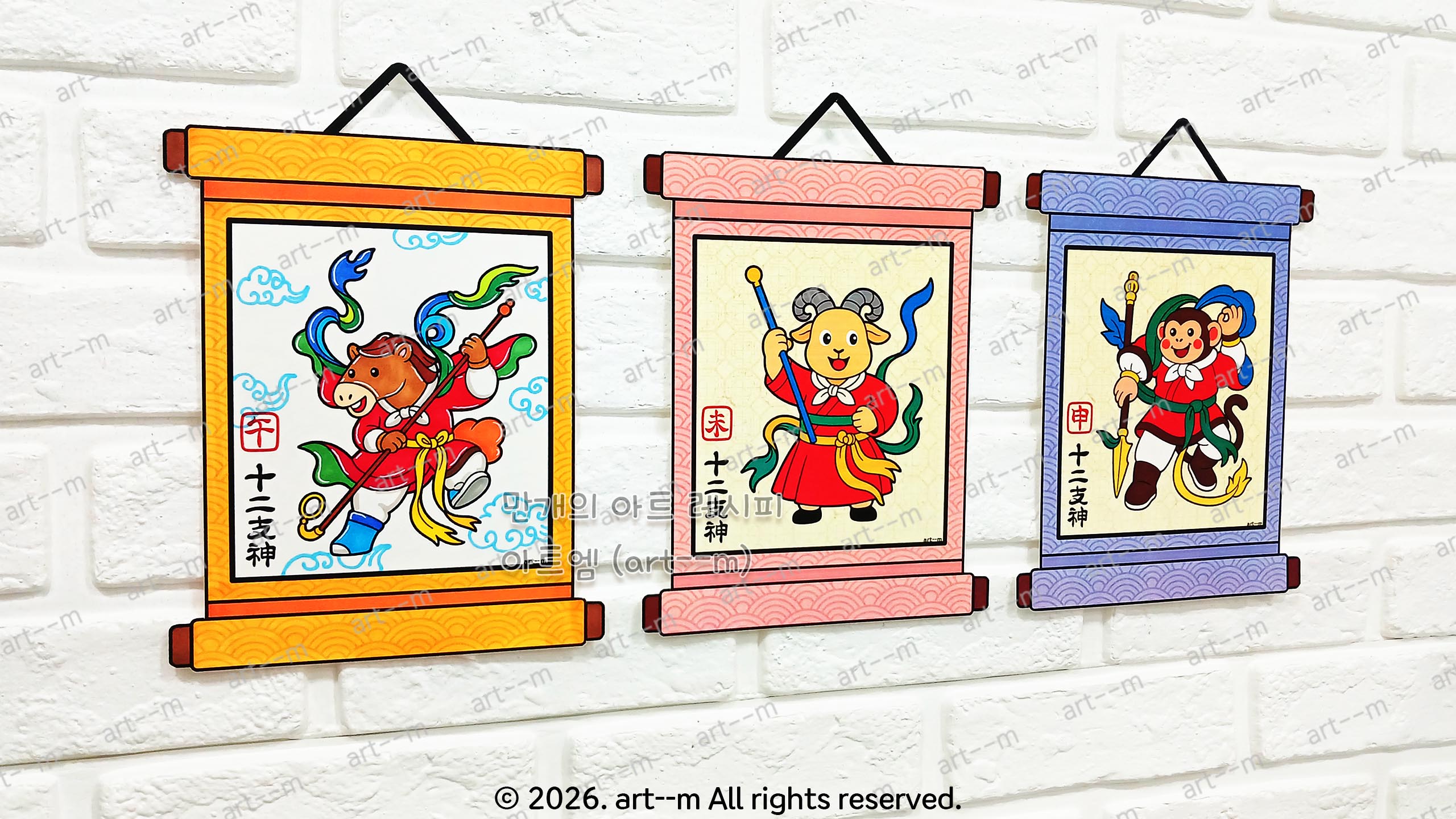 A 세트는 12가지 동물 그림이 있는 12지신 풀 컬러 족자입니다. 색칠도안과 1:1 크기로, 채색에 참고하거나 다양한 전시에 활용할 수 있습니다.