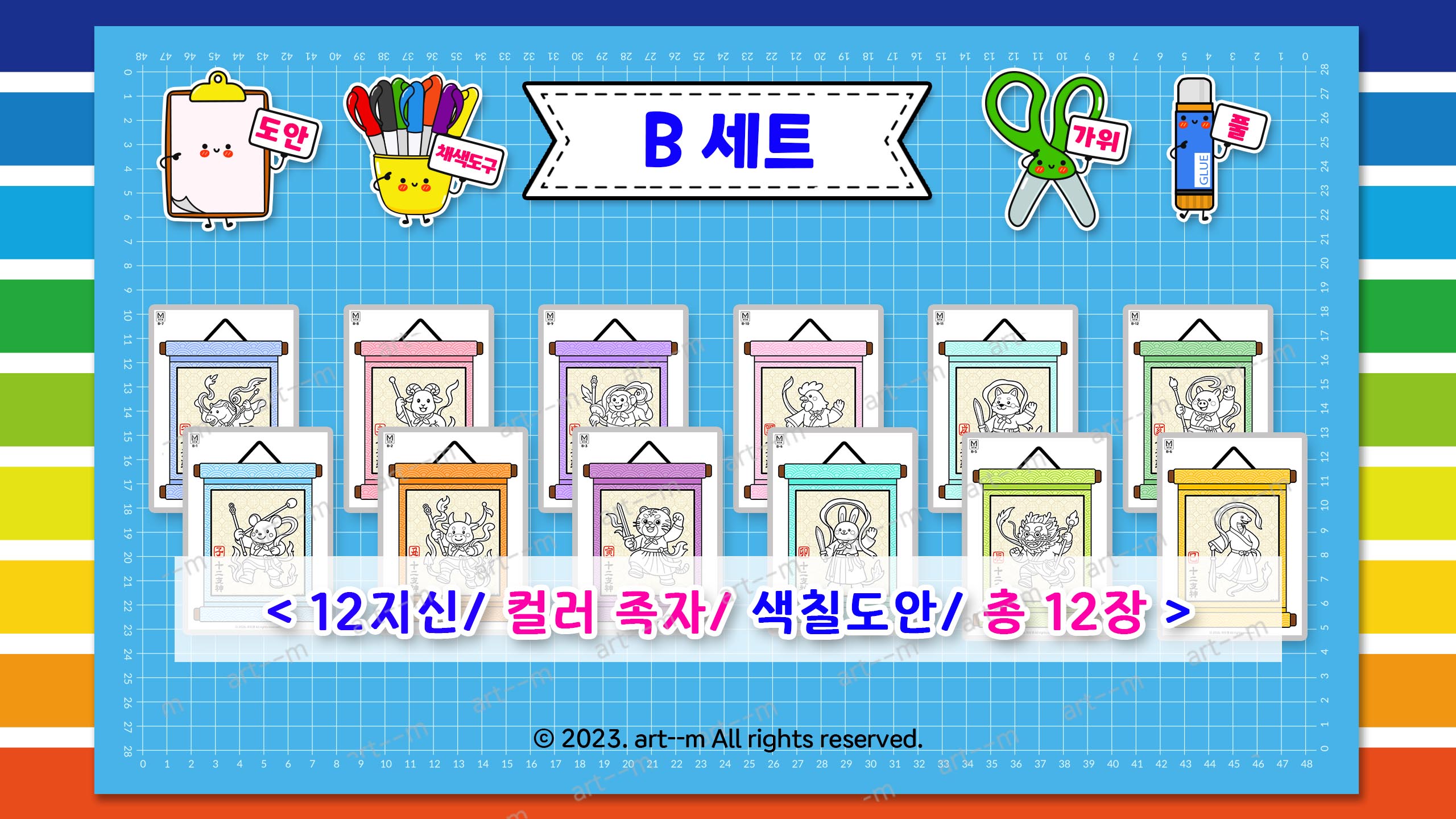 B 세트는 12가지 동물을 채색할 수 있는 컬러 배경 족자 색칠도안입니다.