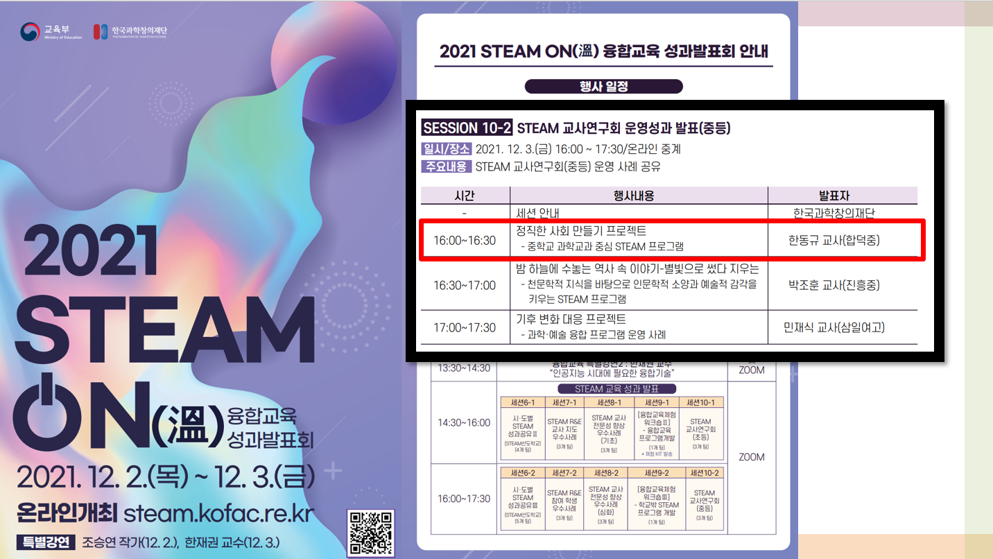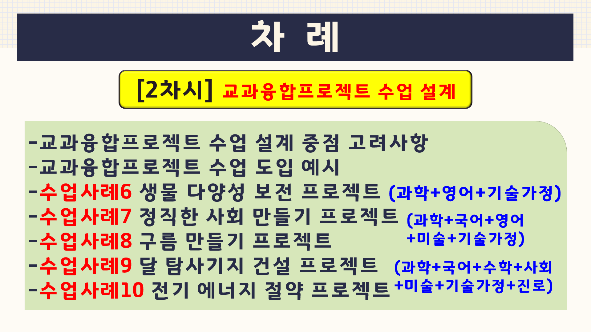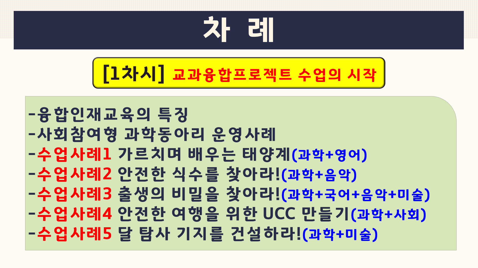 본 연수에서는 융합인재교육의 특징을 비롯하여 사회참여형 과학동아리 운영사례와 10종의 교과융합형 프로젝트 수업 사례를 사진과 동영상 자료와 함께 실감나게 소개해 드립니다. 연수의 차시별 계획은 다음과 같습니다.