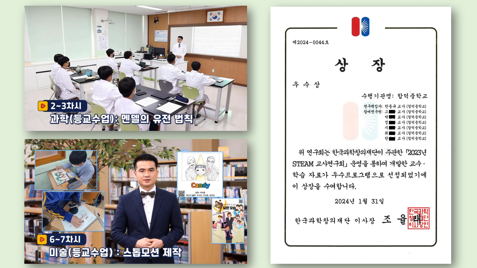 강사는 수년간 교과연구회 운영을 통해 여러 과목의 선생님들과 다양한 주제의 교과 융합 수업을 실천하였습니다. 학생들과 함께한 사회참여형 과학동아리 '우리고장 AR 생태지도 만들기 프로젝트'는 2019년 목정미래재단 미래교육상에서 최우수상을 수상하였습니다. 또한 '정직한 사회 만들기 프로젝트' 수업은 2021년 교육부가 주최하는 융합교육 성과발표회에서 우수사례로 선정되어 전국의 선생님들을 대상으로 발표를 하기도 하였으며, '전기 에너지 절약 프로젝트' 수업은 2023년 전국 우수 사례로 선정되어 함께 수업에 참여한 7명의 선생님들이 함께 상을 받기도 하였습니다. 또한 '출생의 비밀을 찾아라!'수업과 '생물 다양성 보전 프로젝트' 수업은 2021년 중앙교육연수원에 원격연수 콘텐츠(온오프 연계 교육의 실제)로 제작되어 현재도 수업사례가 연수로 소개되고 있습니다.