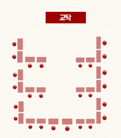 일반적으로 두 줄을 묶어 일제 학습 구조로 자리 배치를 한다. 하지만 어떤 경우는 한 줄 씩 일렬로 배치하는 개별 학습 구조 형태나 시험 대형으로 자리 배치되는 경우가 있다. 어떤 경우에는 ‘ㄷ’자 형태로 자리 배치하기도 한다. 심지어 어떤 경우는 학급 전체 학생들을 하나의 모둠 형태로 자리를 배치한 경우도 있다.