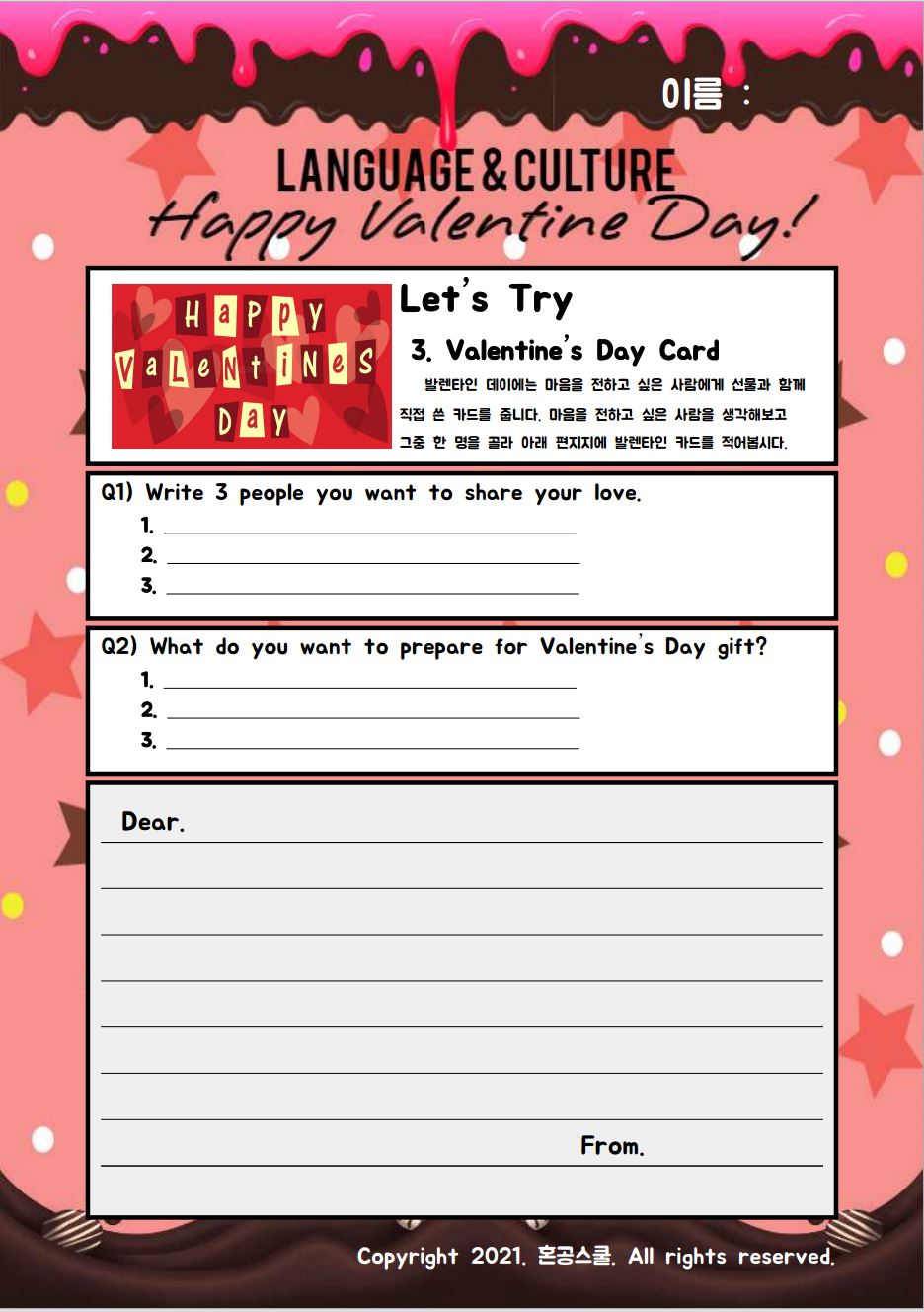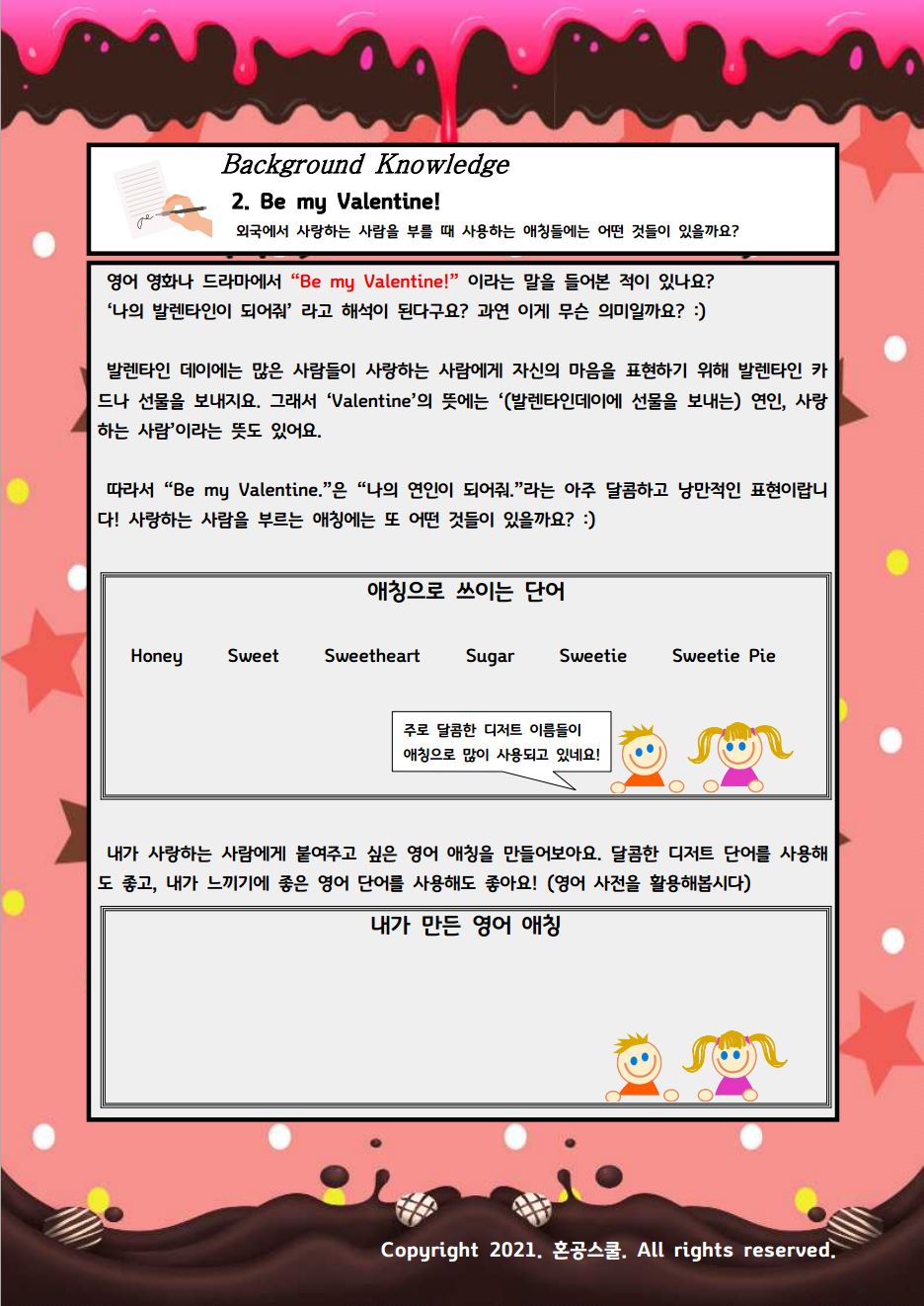 이번 2월 자료는 발렌타인 데이를 맞이하여 활용하기 좋은 영어수업 자료입니다.