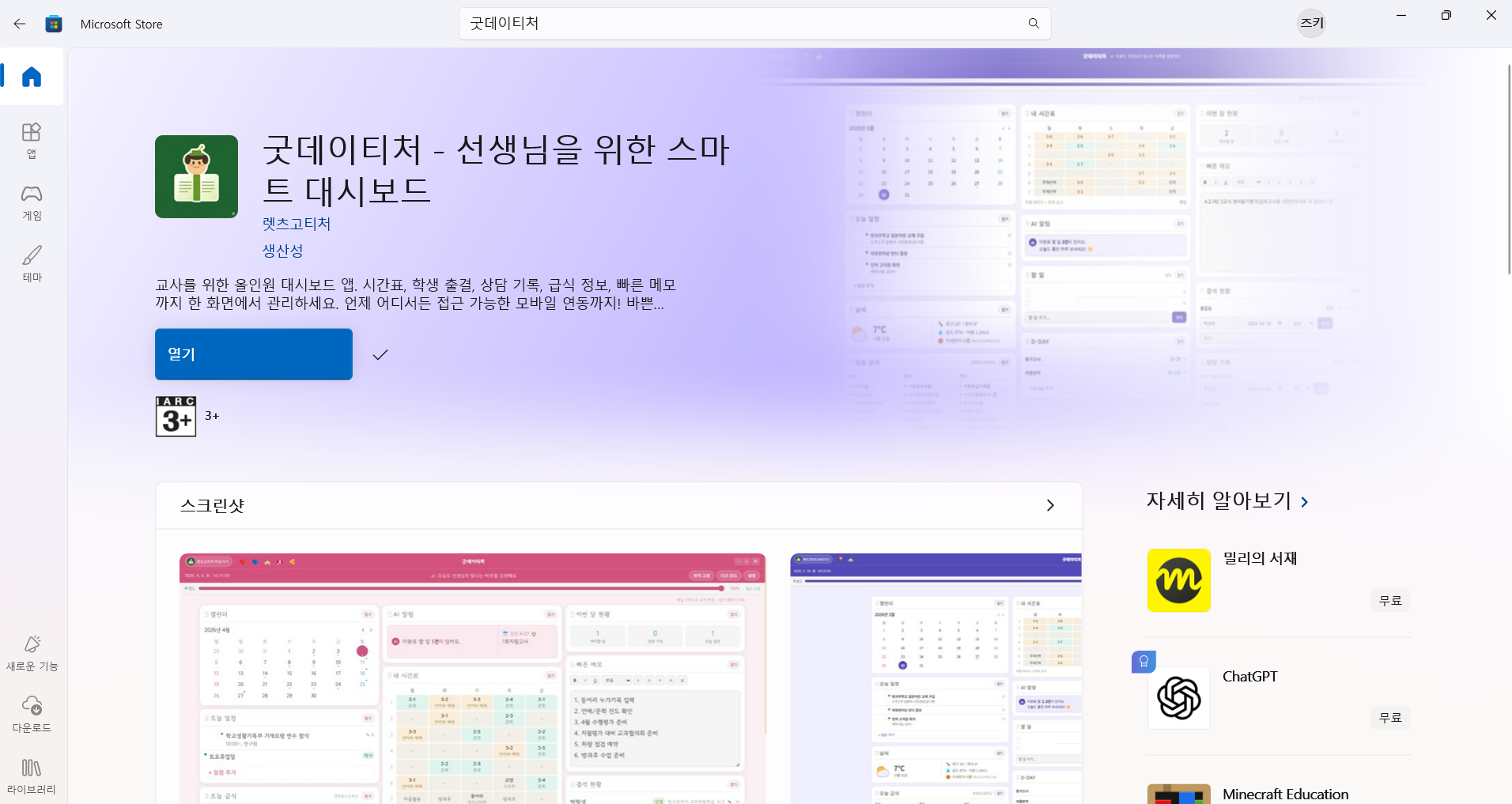 아래 링크에서 다운받으시거나 마이크로소프트 스토어에서 "굿데이티처"를 검색하시면 다운로드받으실 수 있습니다. (모바일 연동 가능)