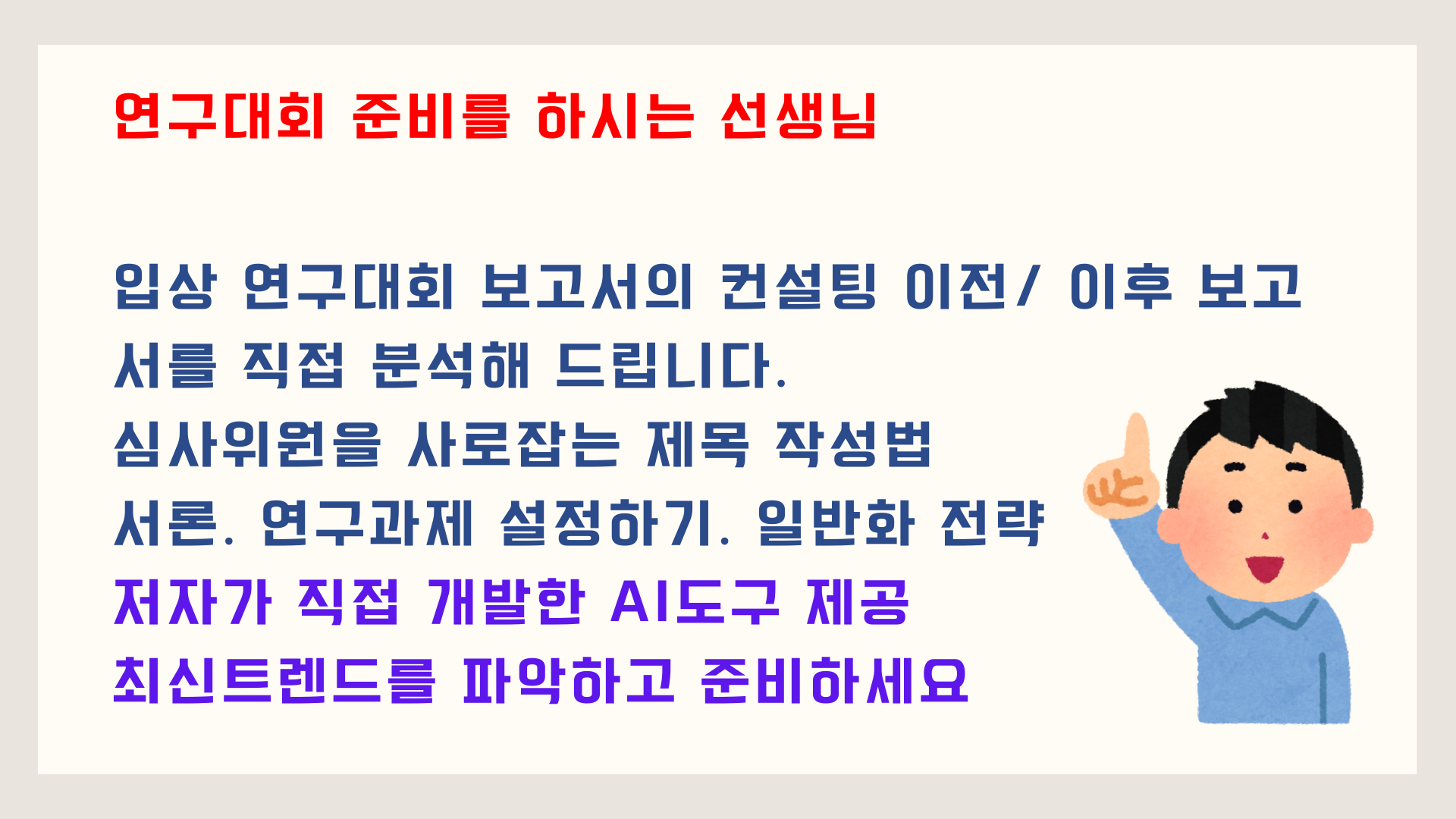 연구대회, 마음은 있지만 주제 선정부터 막혀 망설이고 계셨나요? 선생님의 첫 도전이 외롭지 않도록 든든한 페이스메이커가 되어 드립니다. 요강 분석부터 매력적인 제목 짓기 꿀팁까지, 선생님의 열정이 수상이라는 결실로 이어지도록 꼼꼼하게 돕겠습니다.