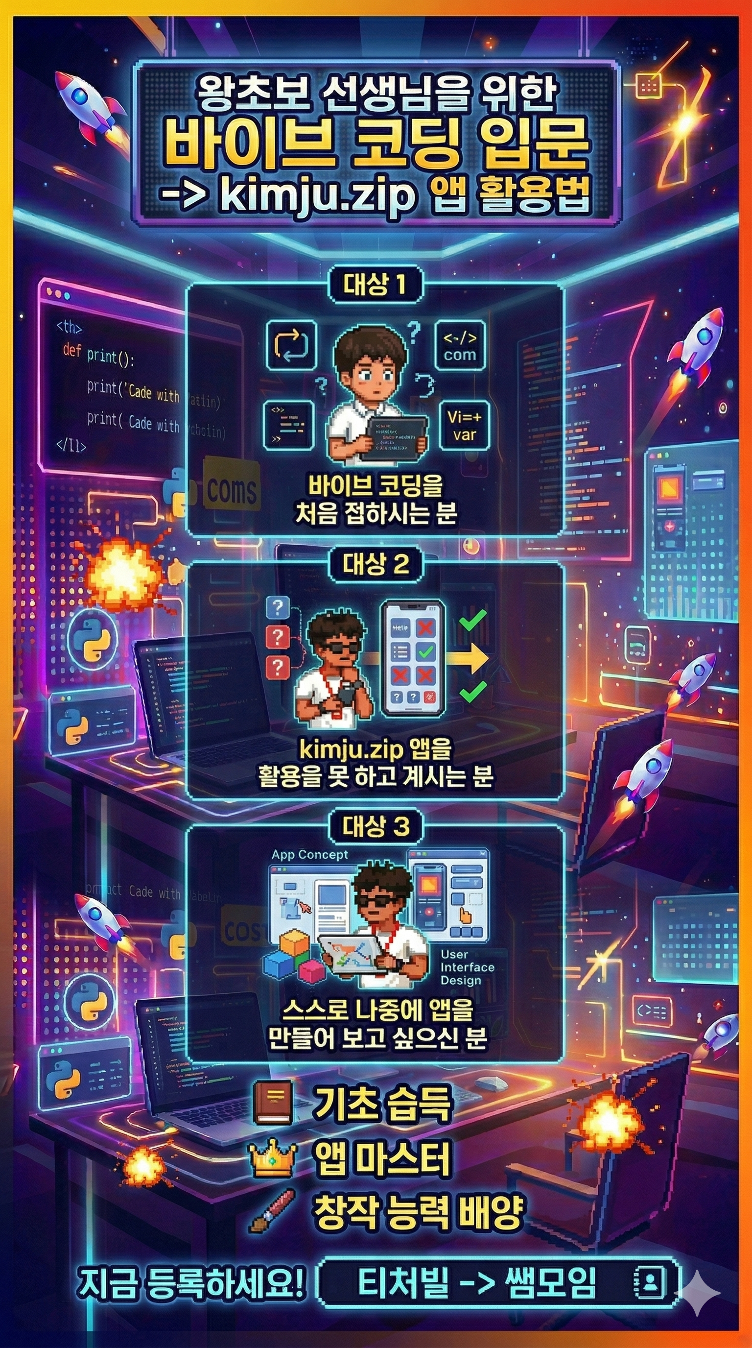 안녕하세요! 👋 그동안 많은 분들이 문의해 주셨던 바이브 코딩 기초 연수를 드디어 개설하게 되었습니다! 🎉 🧐 도대체 바이브 코딩이 무엇인지? 📱 kimju.zip 앱은 어떻게 활용해야 하는지? 💡 그럼 나도 직접 만들 수 있는지?! 평소에 이런 궁금증을 가지고 계셨던 분들이라면 신청해 주세요! 🙌 정말 초초초초보에 적합한 연수입니다. 어느정도 스스로 하실 수 있는 분들은 다음 기회에 뵈요 ^^ ✅ 준비물: 구글 아이디 (Google ID) 🔑 감사합니다.