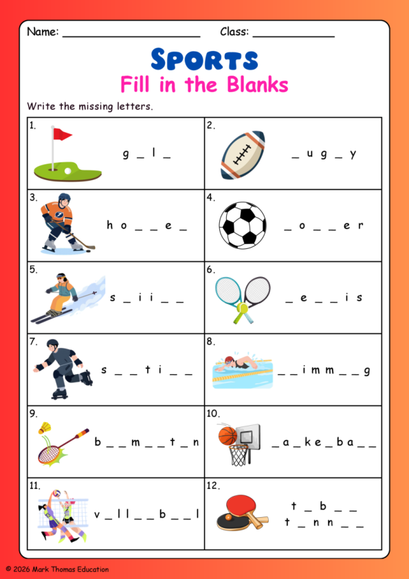 스펠링 실력을 정교하게! 12개 핵심 단어의 빠진 철자를 채우며 파닉스와 철자 기억력에 집중하는 활동입니다. 읽기 단계에서 독립적인 쓰기 단계로 넘어가는 환상적인 방법입니다.