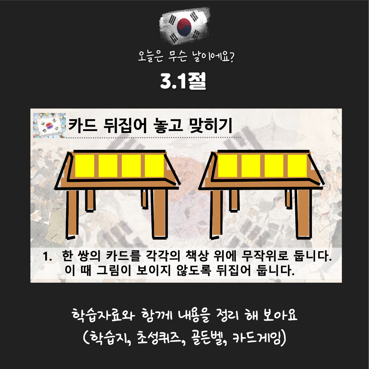 지루하거나 너무 오래된 영상이 대부분이였던 계기교육 영상을 아이들 눈높이에 맞춰 쉽고 재미있게 풀어 보았습니다! 영상을 다 본 후 4가지 3.1절 활동을 해 보아요. 학습지부터 카드게임까지 준비하였습니다.