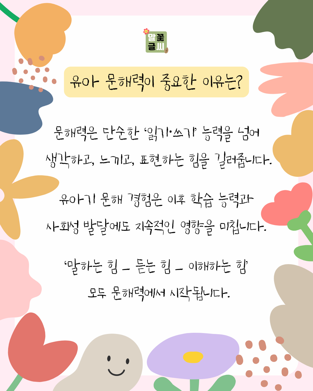 문해력은 단순한 ‘읽기·쓰기’ 능력을 넘어 생각하고, 느끼고, 표현하는 힘을 길러줍니다.