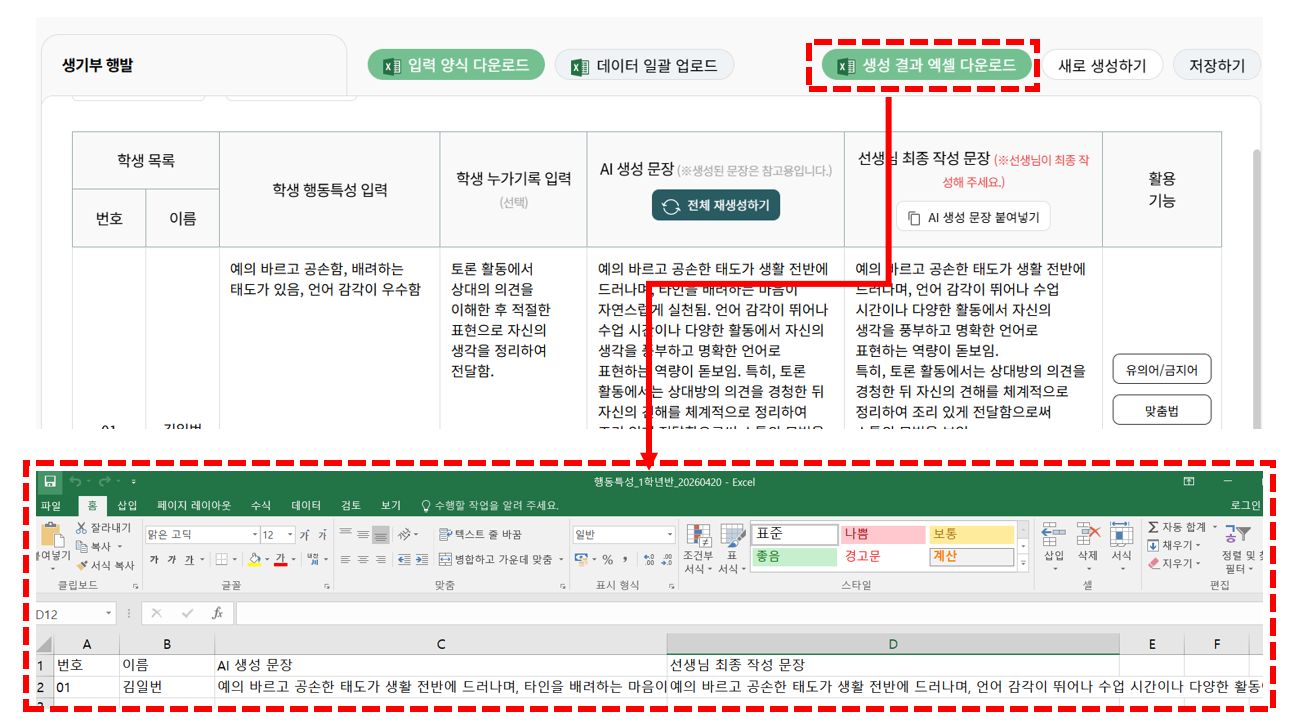 - ‘생성 결과 엑셀 다운로드’ 버튼을 클릭하면, 학생별 AI 생성 문장과 최종 작성 문장을 내려받을 수 있습니다.