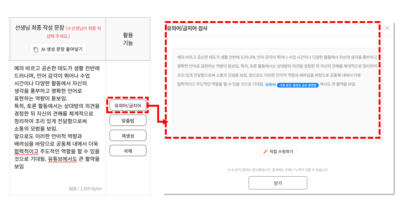- 유의어/금지어 검사를 통해 문장을 점검하고, ‘직접 수정하기’로 하단에서 바로 수정·반영할 수 있습니다.