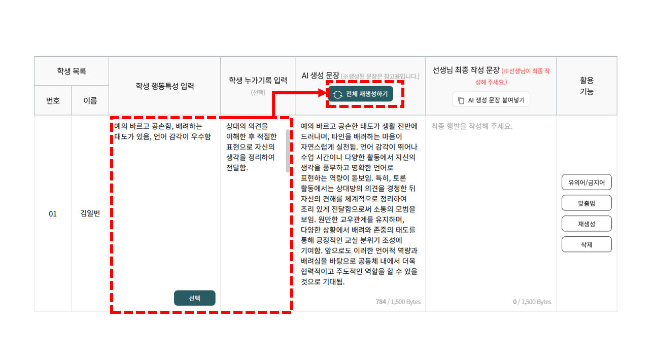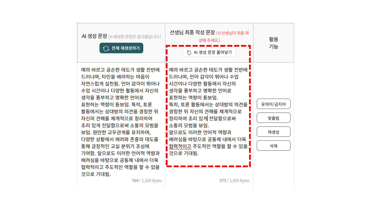 - AI 생성 문장은 참고용으로 활용하시고, 최종 문장은 선생님이 직접 작성해 주세요.