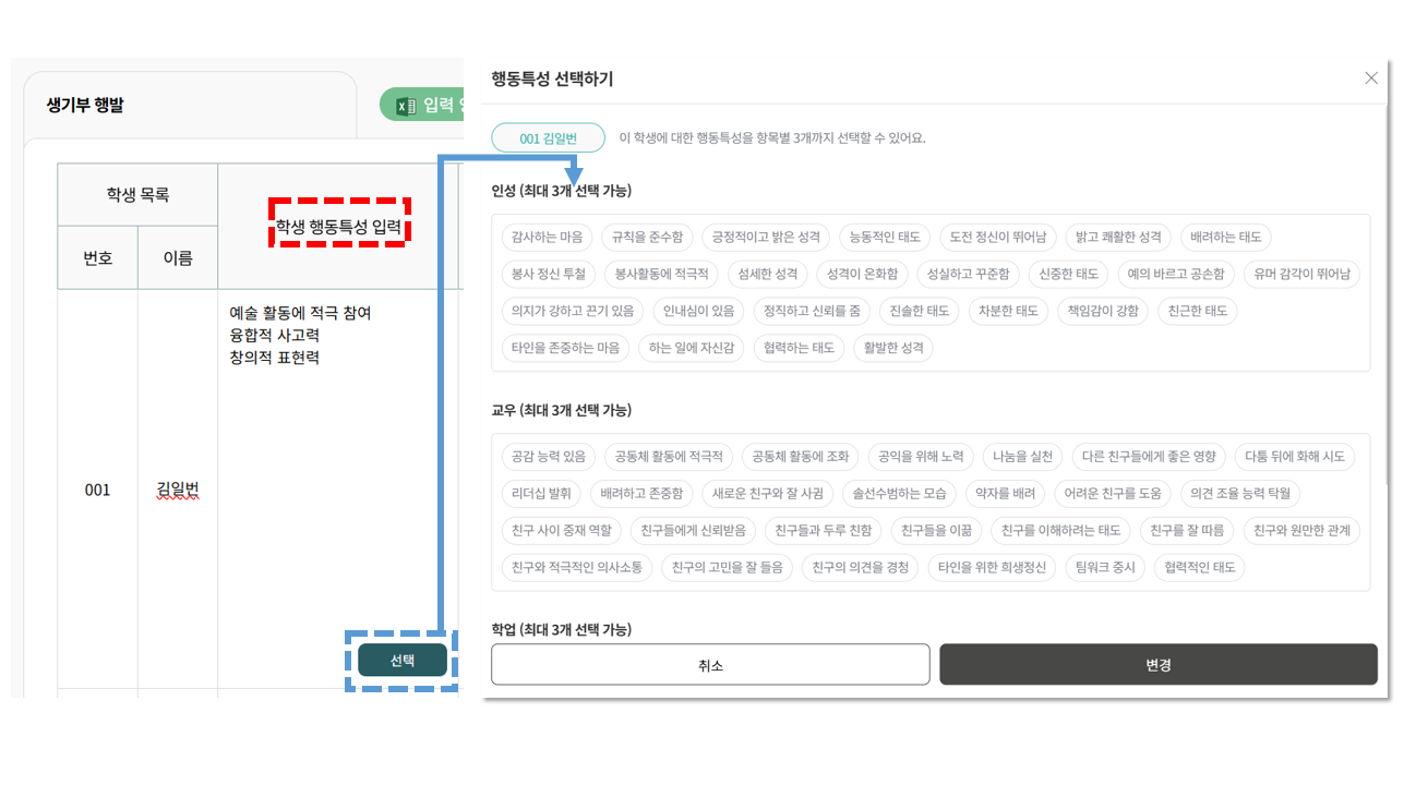 - 학생 행동특성 입력 부분은 텍스트로 직접 입력하거나, 인성·교우·학업 항목에서 영역별 최대 3개까지 선택 가능