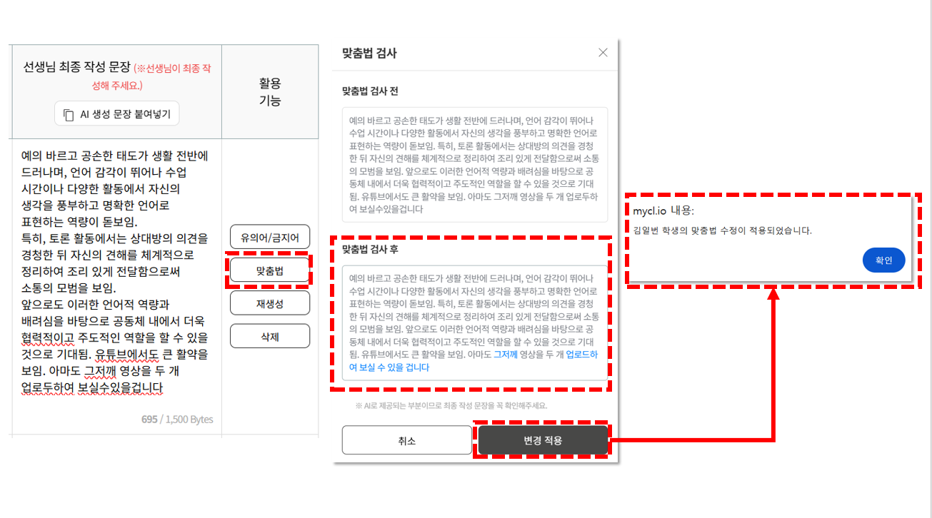 - 맞춤법 검사를 통해 문장을 점검하고, ‘변경 적용하기’를 통해 수정된 내용을 반영할 수 있습니다.