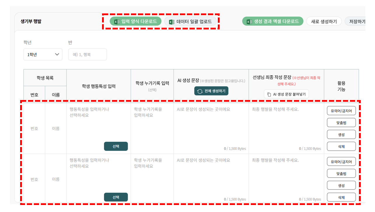 📌 생기부 행발 데이터는 ‘입력 양식 다운로드 후 일괄 업로드’와 ‘수기 입력’ 두 가지 방법으로 입력할 수 있습니다.