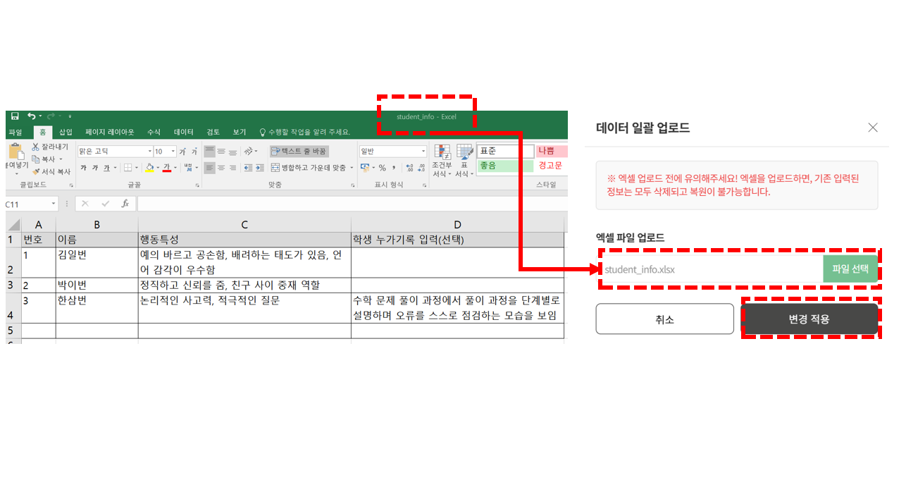 - '입력 양식 다운로드' 버튼 → 엑셀 데이터 작성(파일명 : student_info) → '데이터 일괄 업로드' 버튼 → 엑셀 파일 업로드 → ‘변경 적용’ 버튼