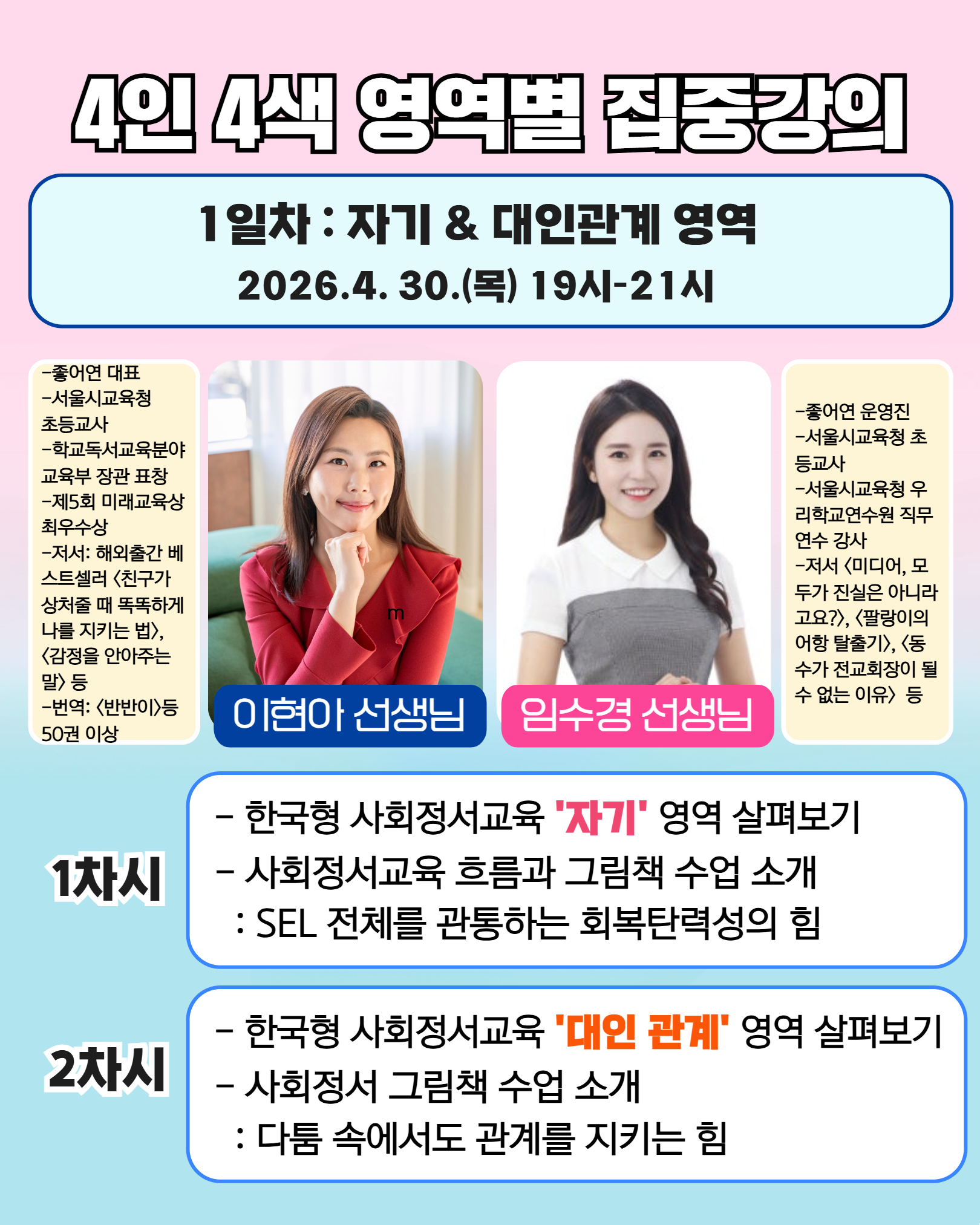 - 4월 30일 (목) 19:00~21:00 1일차 - 자기 & 대인관계 영역 *본 페이지는 1일차 강의 신청 페이지입니다.