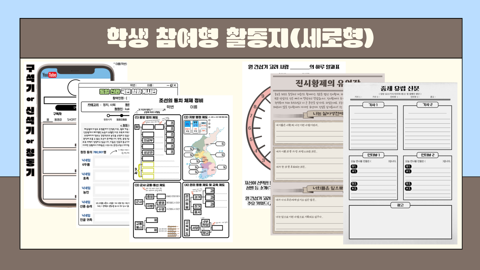 (2시간 분량 강의 영상 + 100p 강의 원고 + 54차시 생각질문 및 발문 사례 + 40p 역사 수업 학생 참여형 활동지)