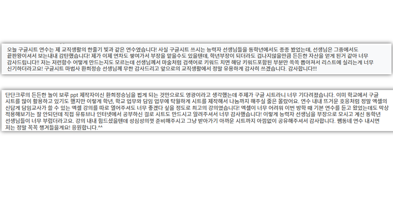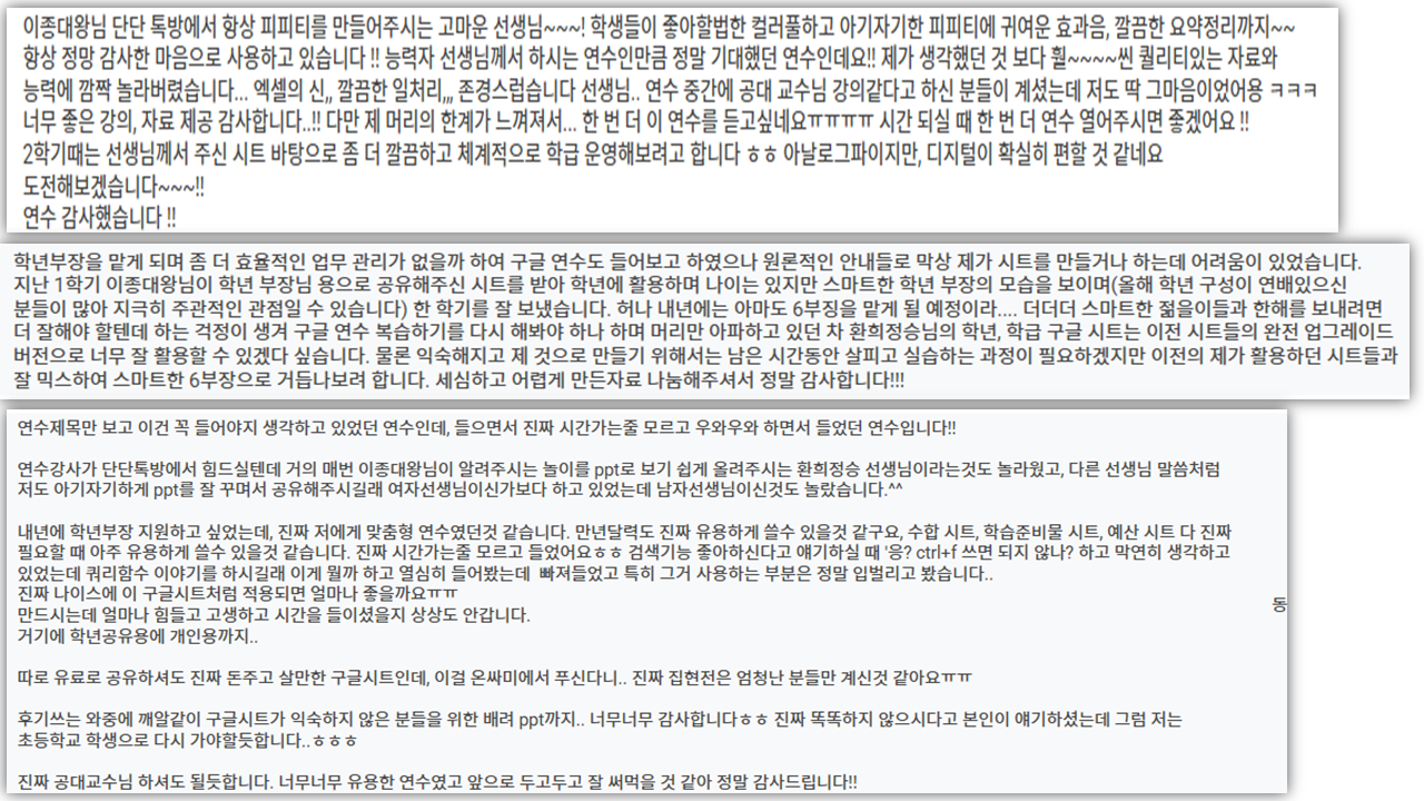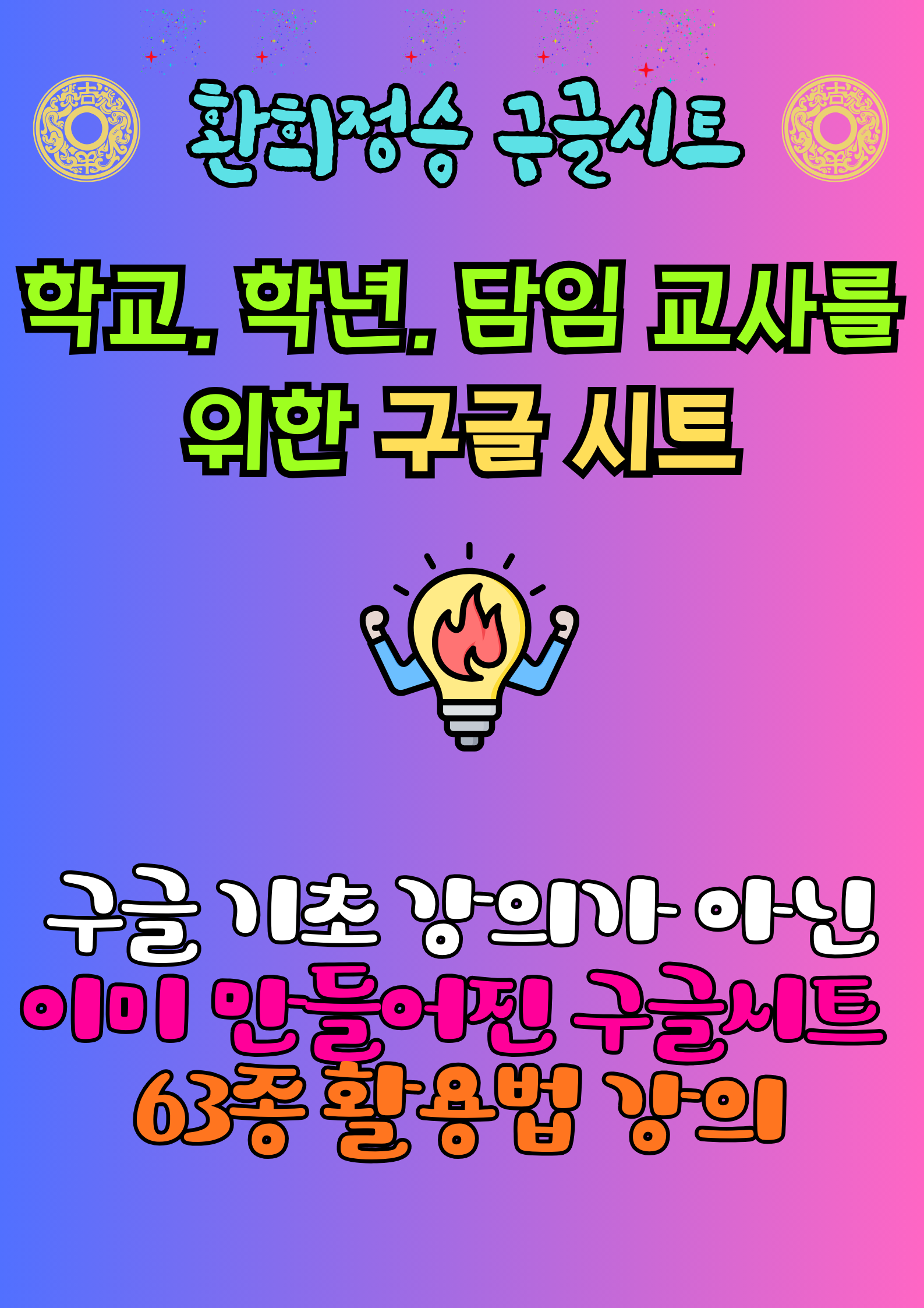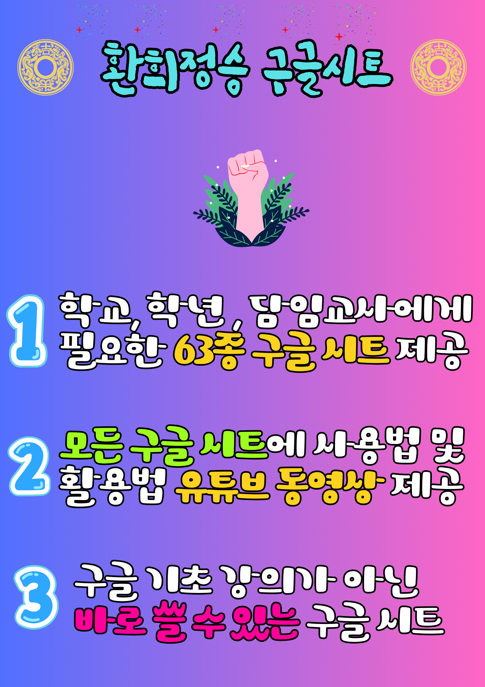 구글 시트를 사랑하고 연구하는 집현전 환희정승입니다. 학교 업무 효율화를 위해서 학교 전체적으로, 학년 선생님들과 함께, 그리고 담임교사로서 활용할 수 있는 구글 시트를 꾸준히 연구하고 있습니다.