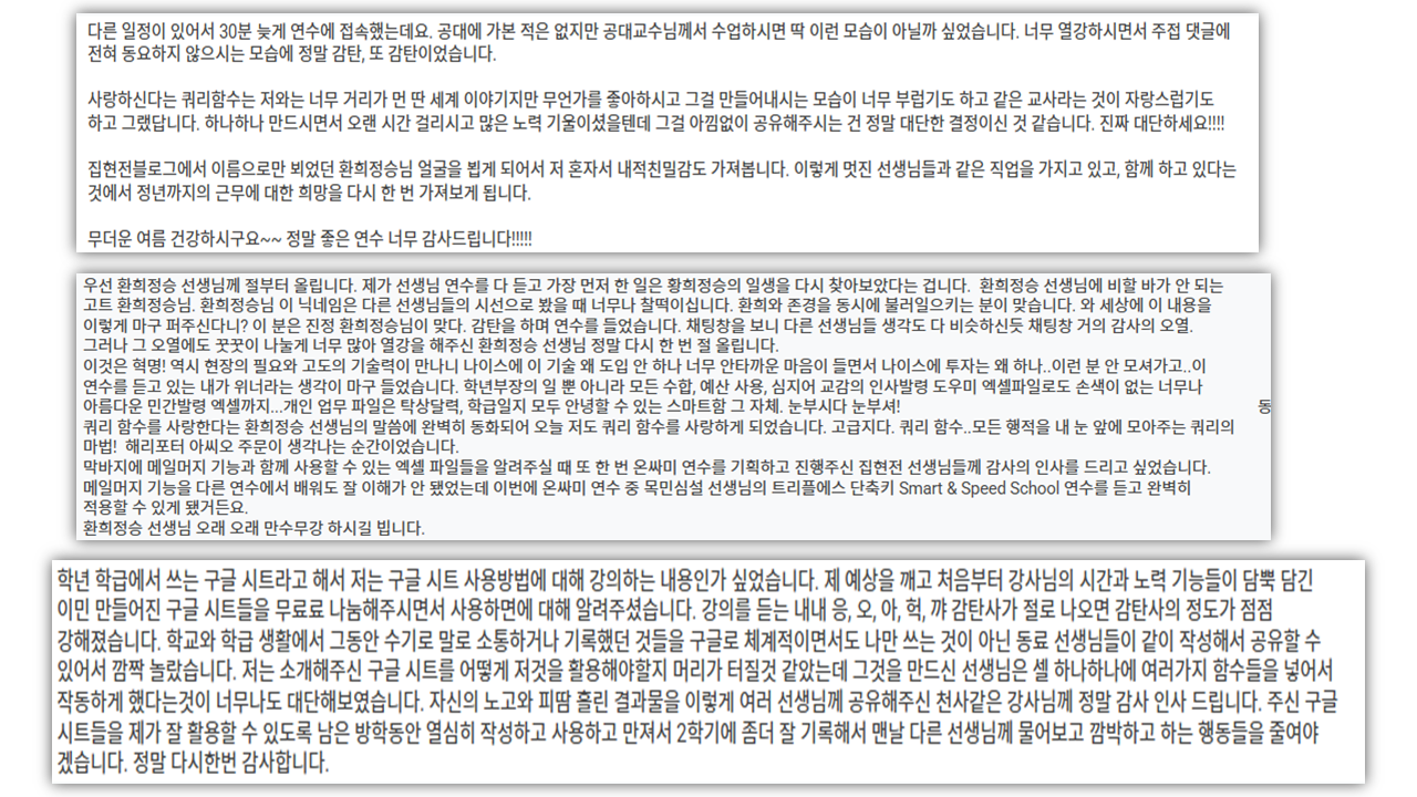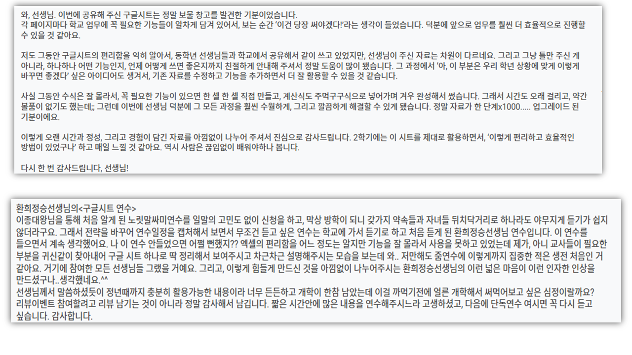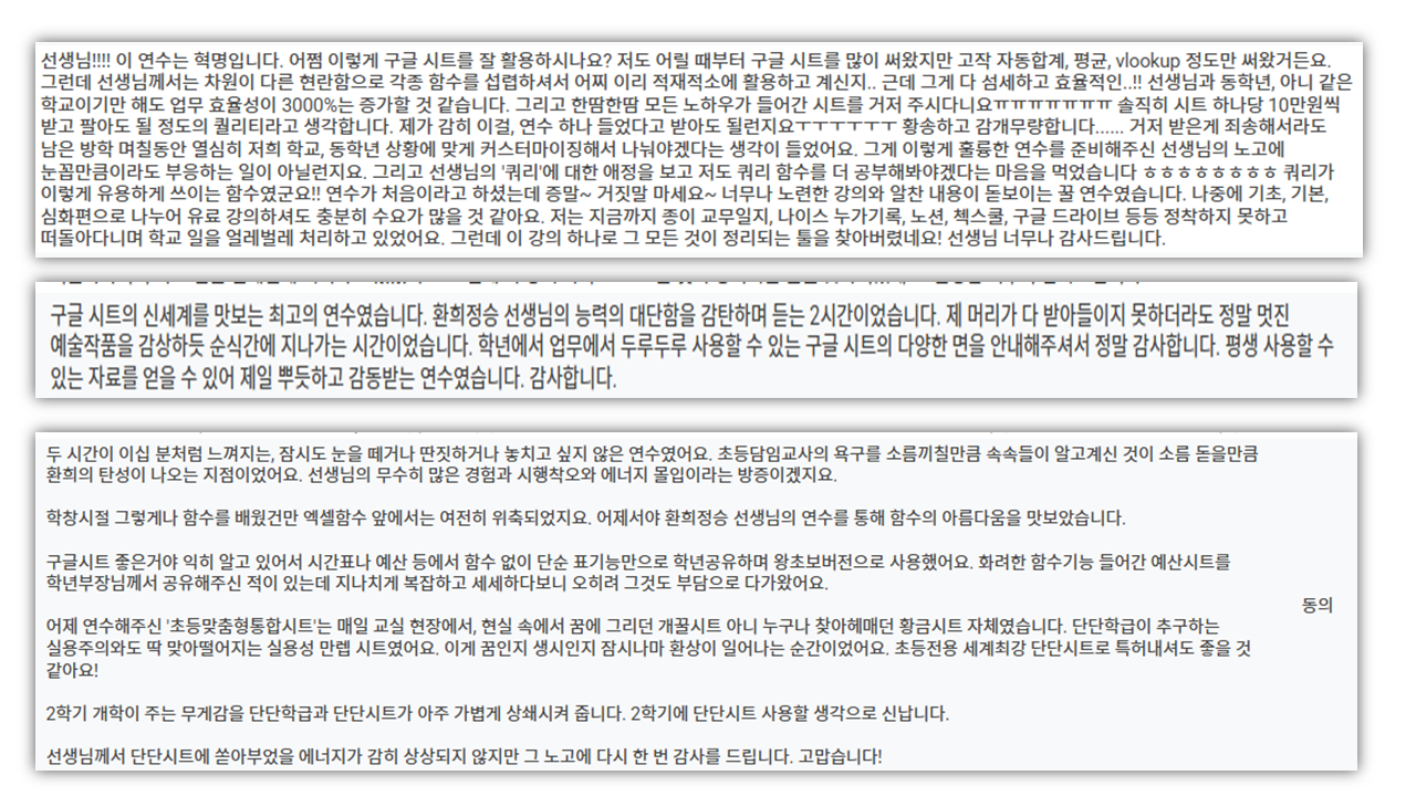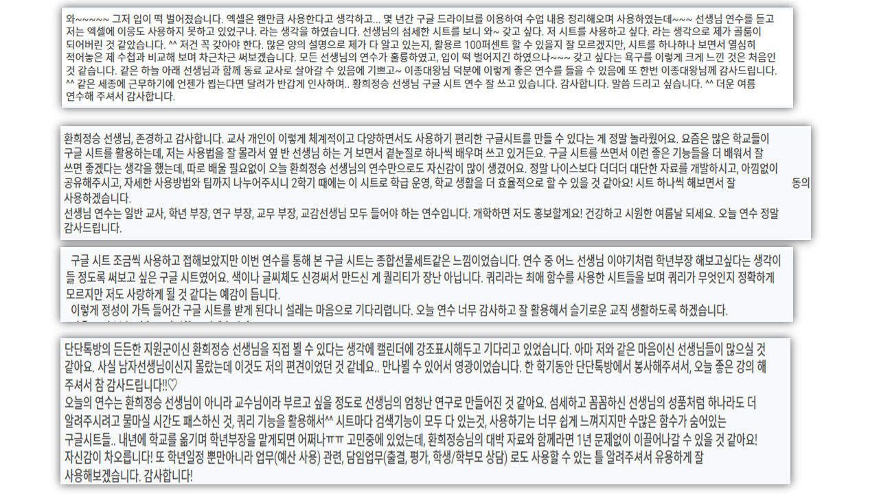 구글 시트를 사랑하고 연구하는 집현전 환희정승입니다. 학교 업무 효율화를 위해서 학교 전체적으로, 학년 선생님들과 함께, 그리고 담임교사로서 활용할 수 있는 구글 시트를 꾸준히 연구하고 있습니다.