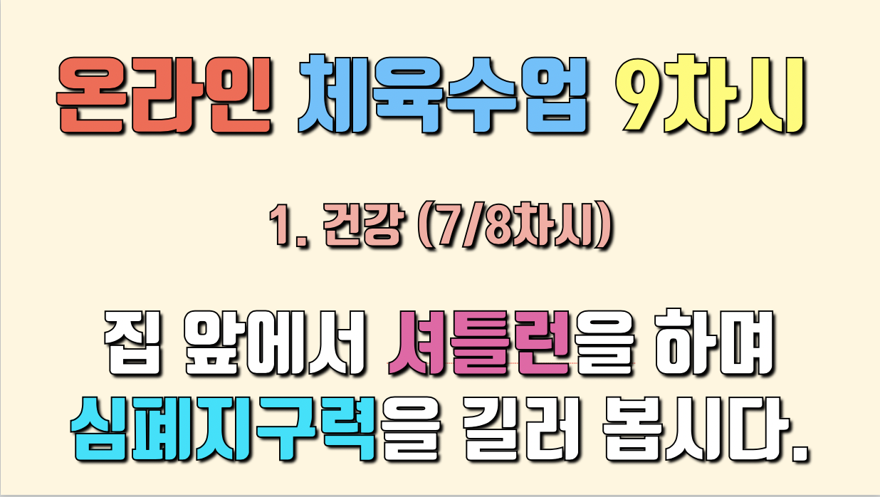◯ 학습문제 : 집 앞에서 셔틀런을 하며 심폐지구력을 길러 봅시다.