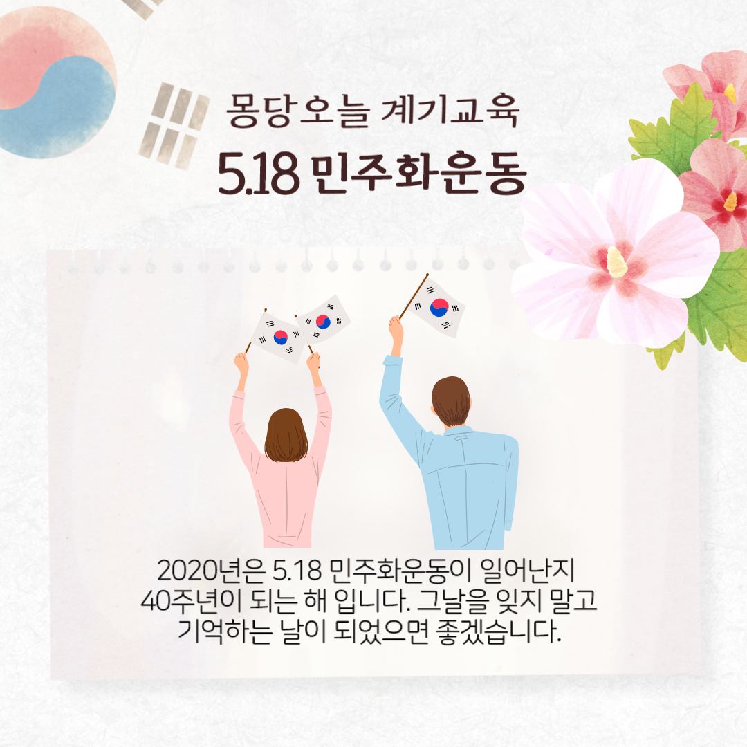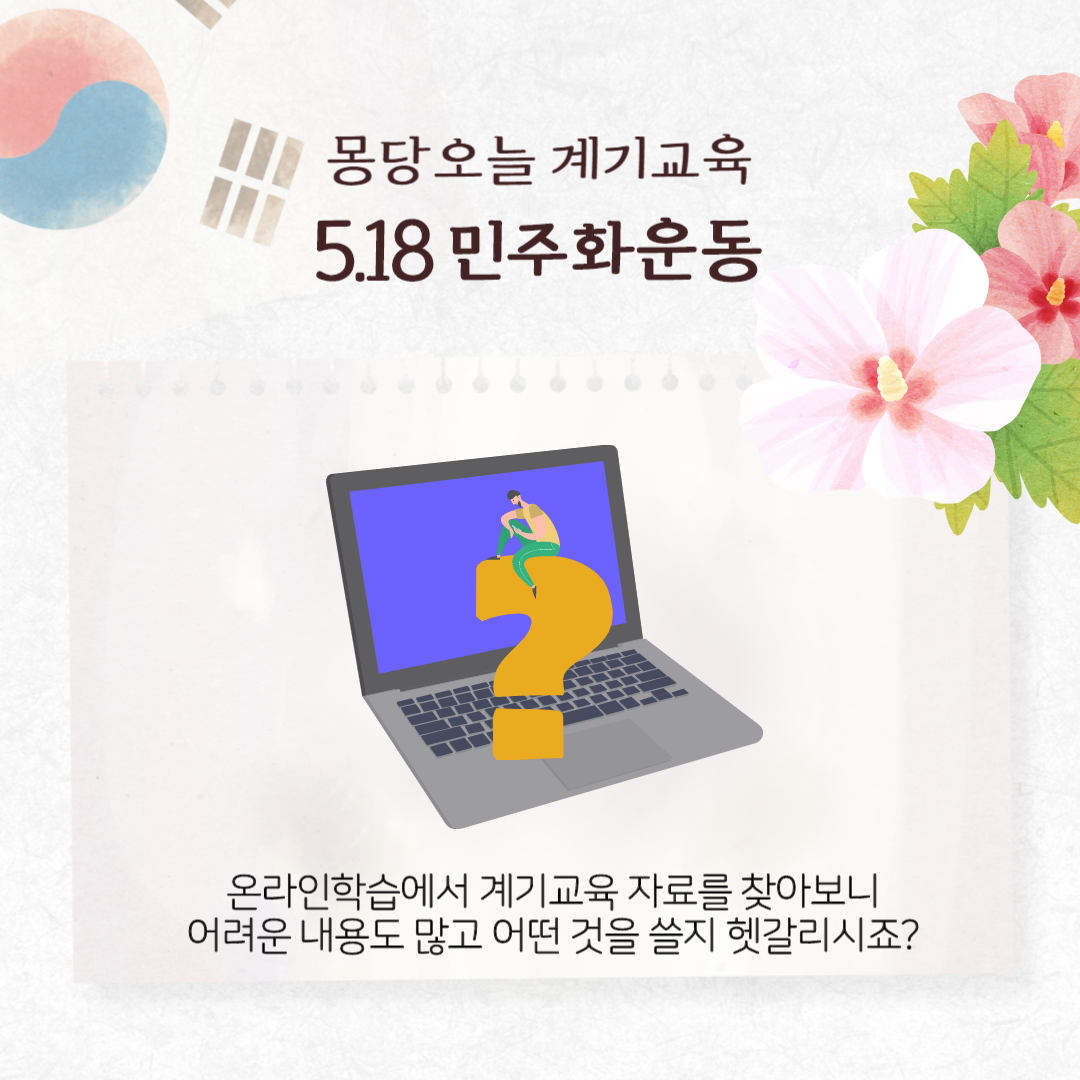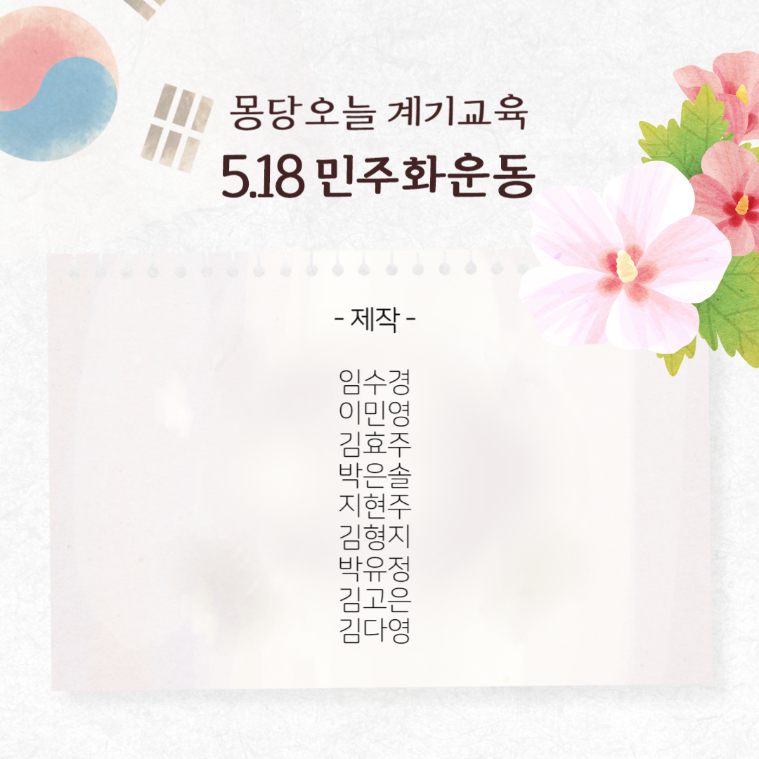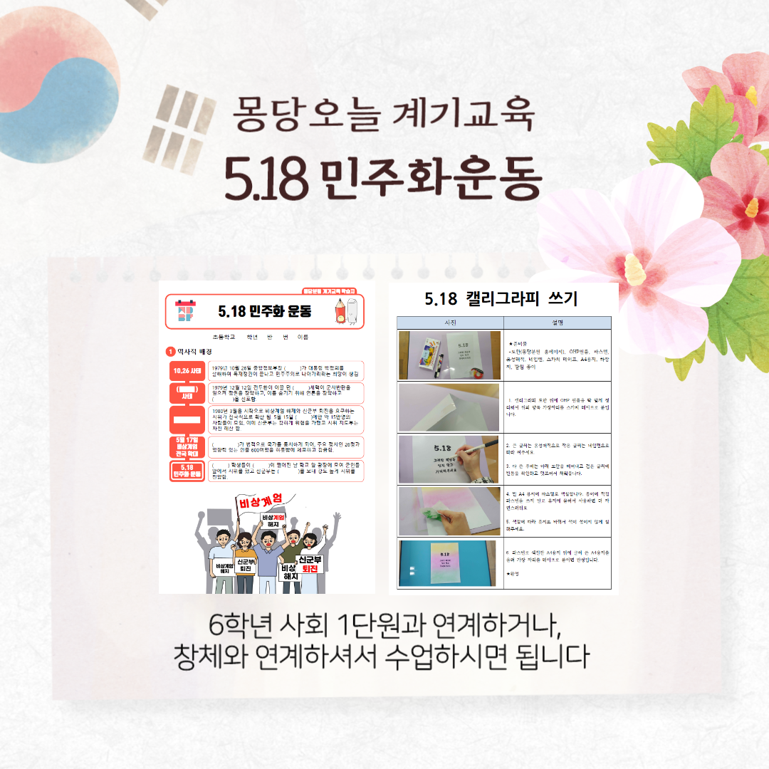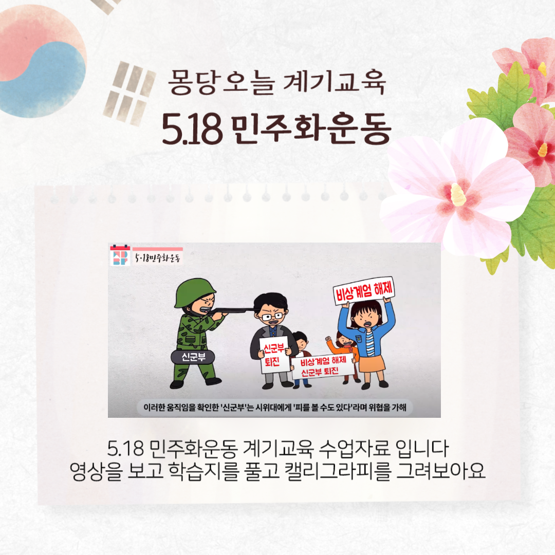 영상을 다 본 후 5.18 민주화운동 학습지를 풀고 마음을 담아 캘리그라피를 그려보고 퀴즈앤으로 정리해보아요~