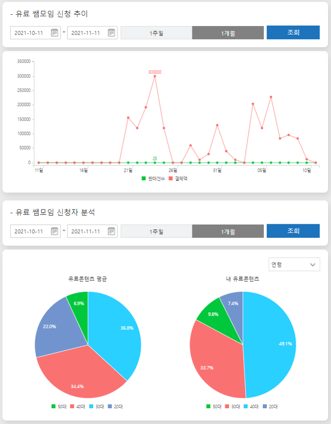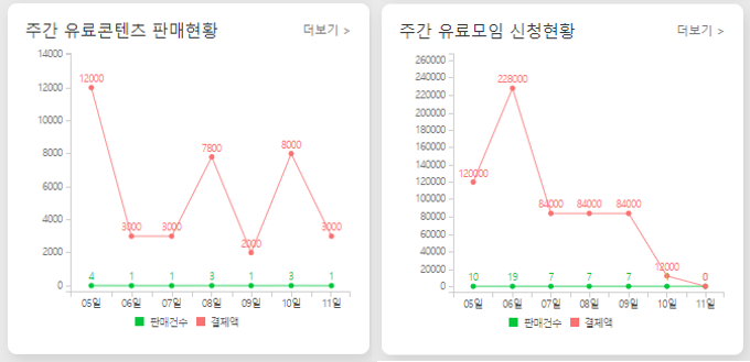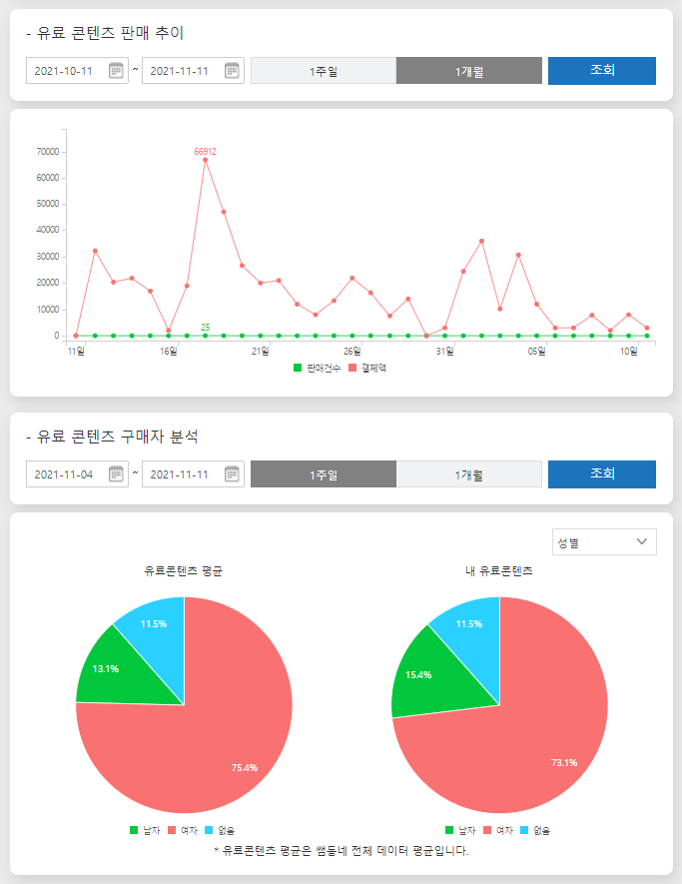 콘텐츠 통계와 모임통계에서도 마찬가지로! 조회순위, 판매순위, 판매추이를 확인 할 수 있어요!