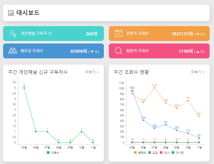 대시보드에서는 콘텐츠와 쌤모임, 쌤찾자의 조회수 확인은 물론, 개인채널 구독자 수도 한눈에 확인 할 수 있어요!