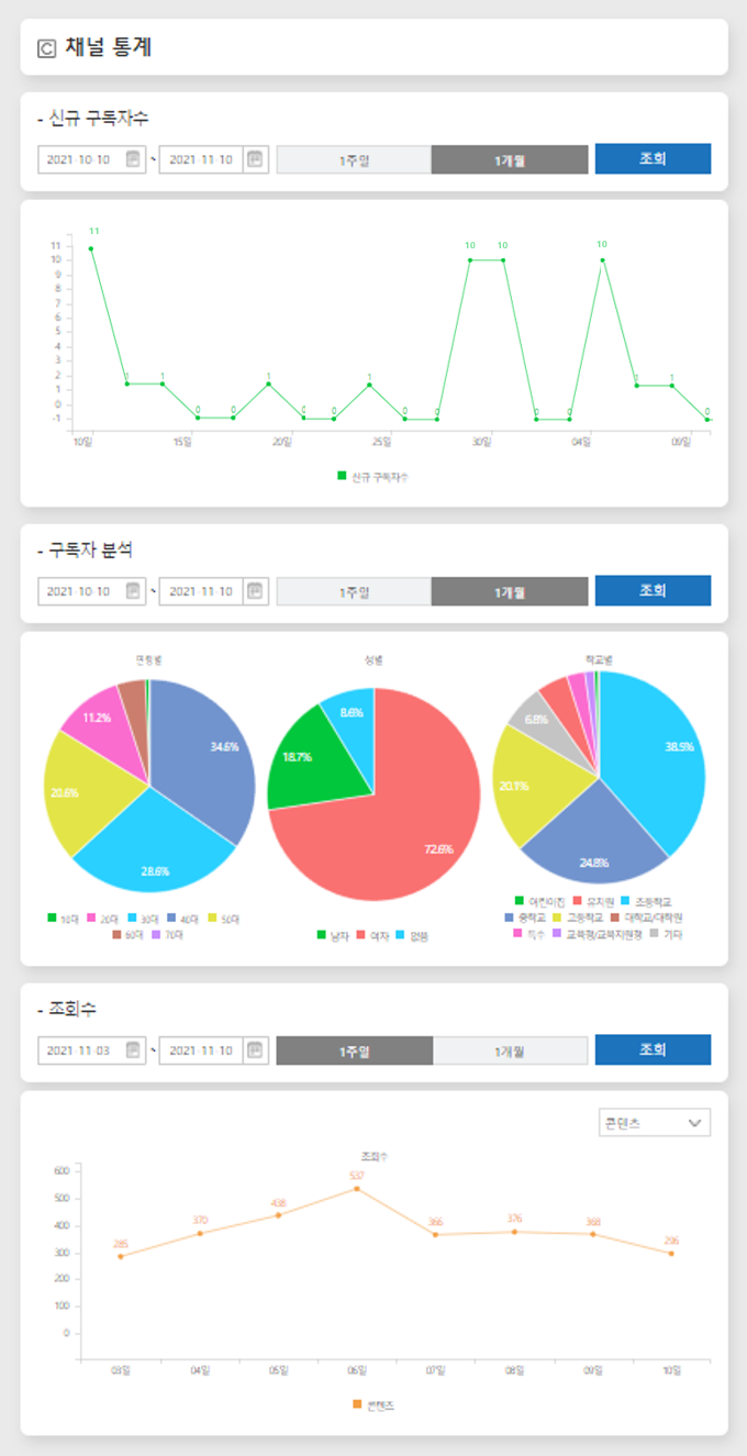 채널 통계에서는 신규 구독자수, 구독자 분석, 콘텐츠와 쌤모임의 조회수에 관한 데이터를 확인 할 수 있어요!
