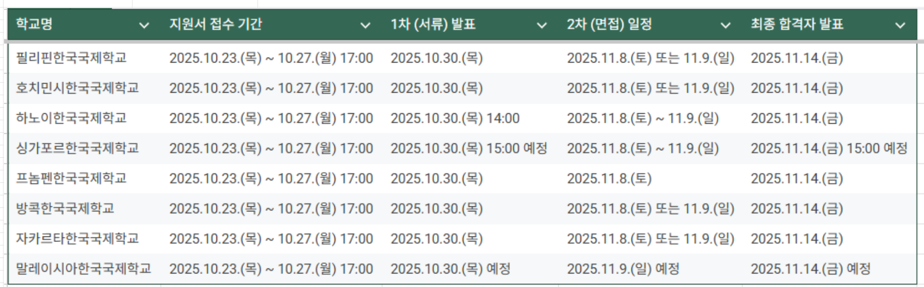 현재 공고가 확인된 동남아시아 지역 주요 한국학교의 채용 일정을 표로 정리했습니다. 학교별 모집 분야, 접수 기간, 문의처 등을 반드시 공식 공고문을 통해 재차 확인하세요. (붙임 파일 확인)
