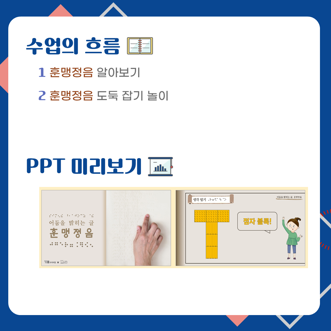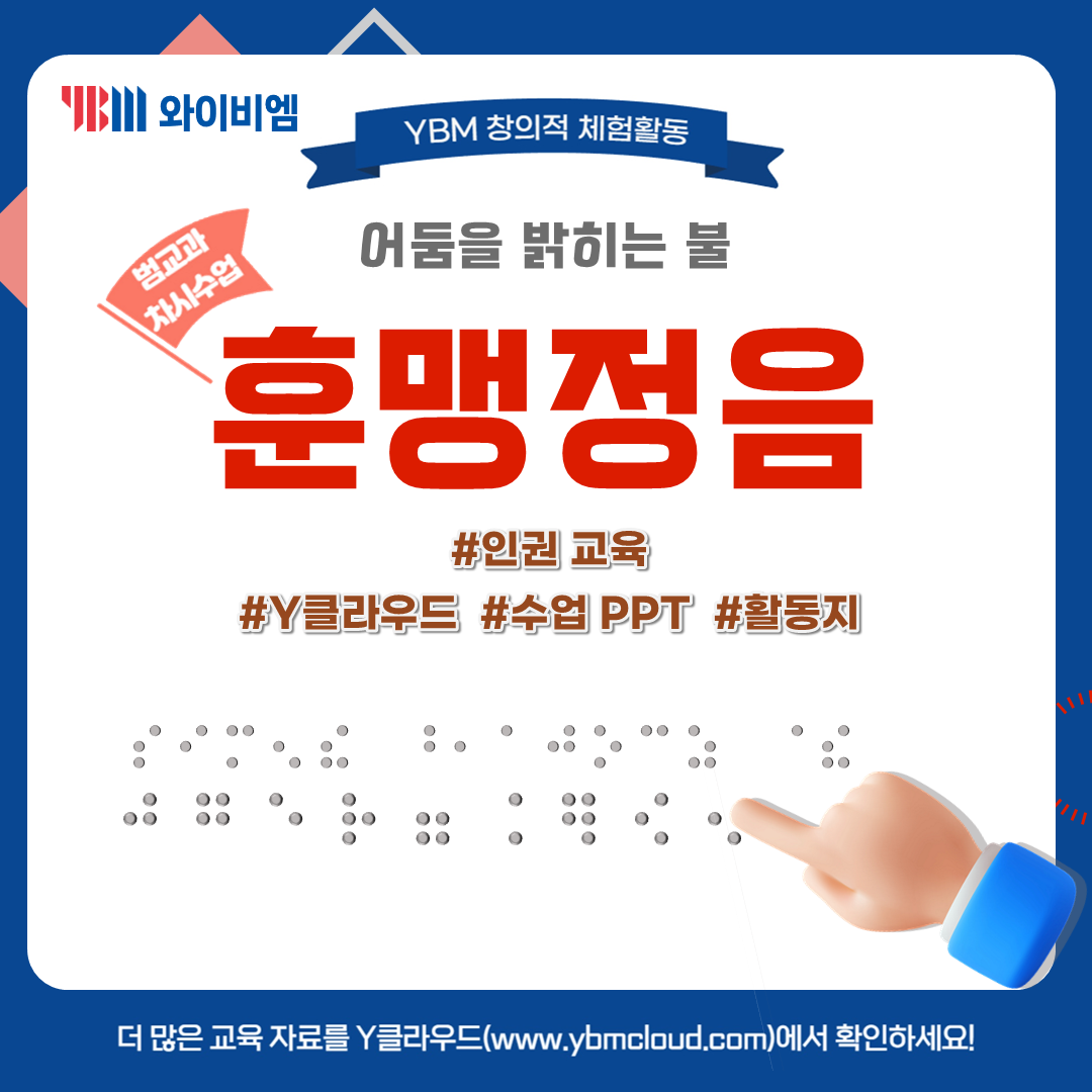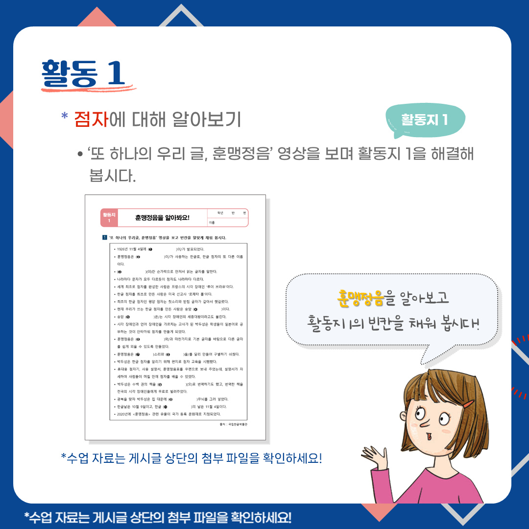 🎉 첨부 파일 자료 구성: '어둠을 밝히는 불 훈맹정음' 수업 PPT, 수업지도안, 활동지 제공