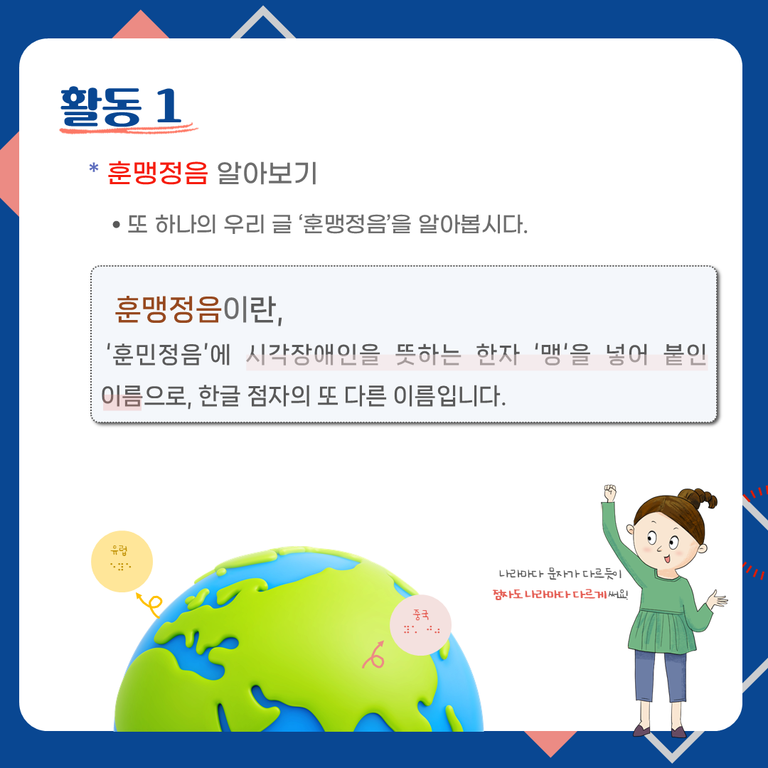 우리나라의 점자인 훈맹정음의 탄생 과정과 점자 읽는 방법을 알아봅시다.