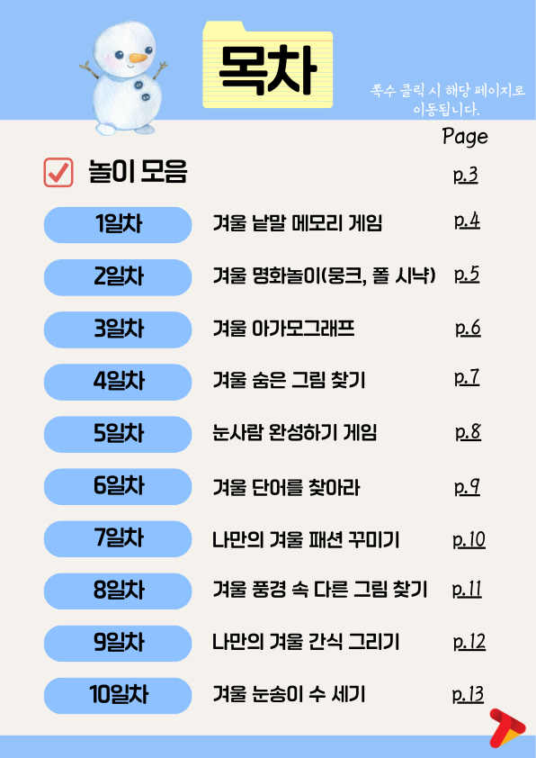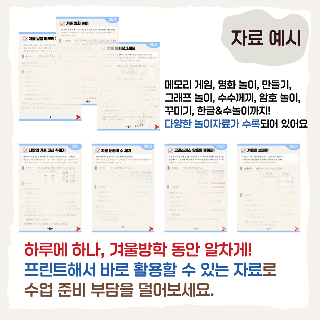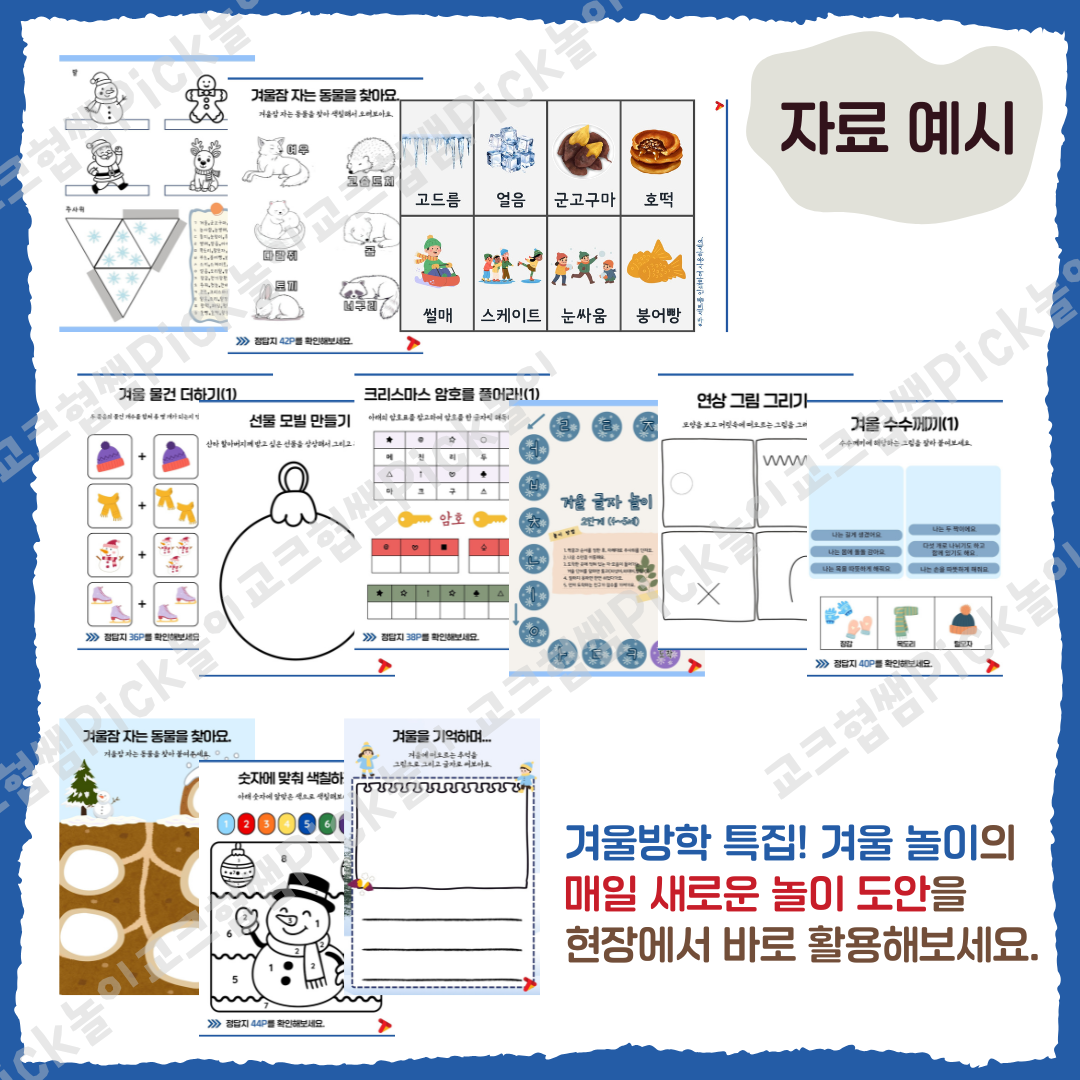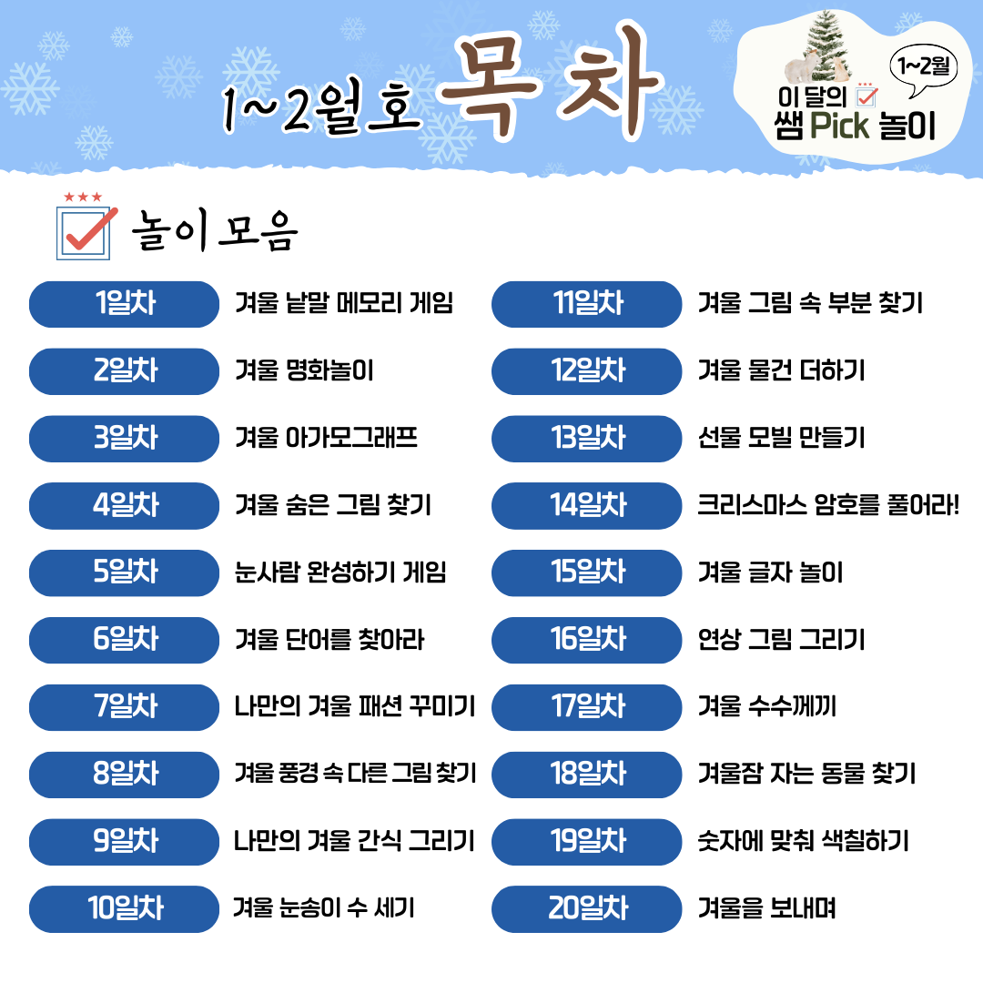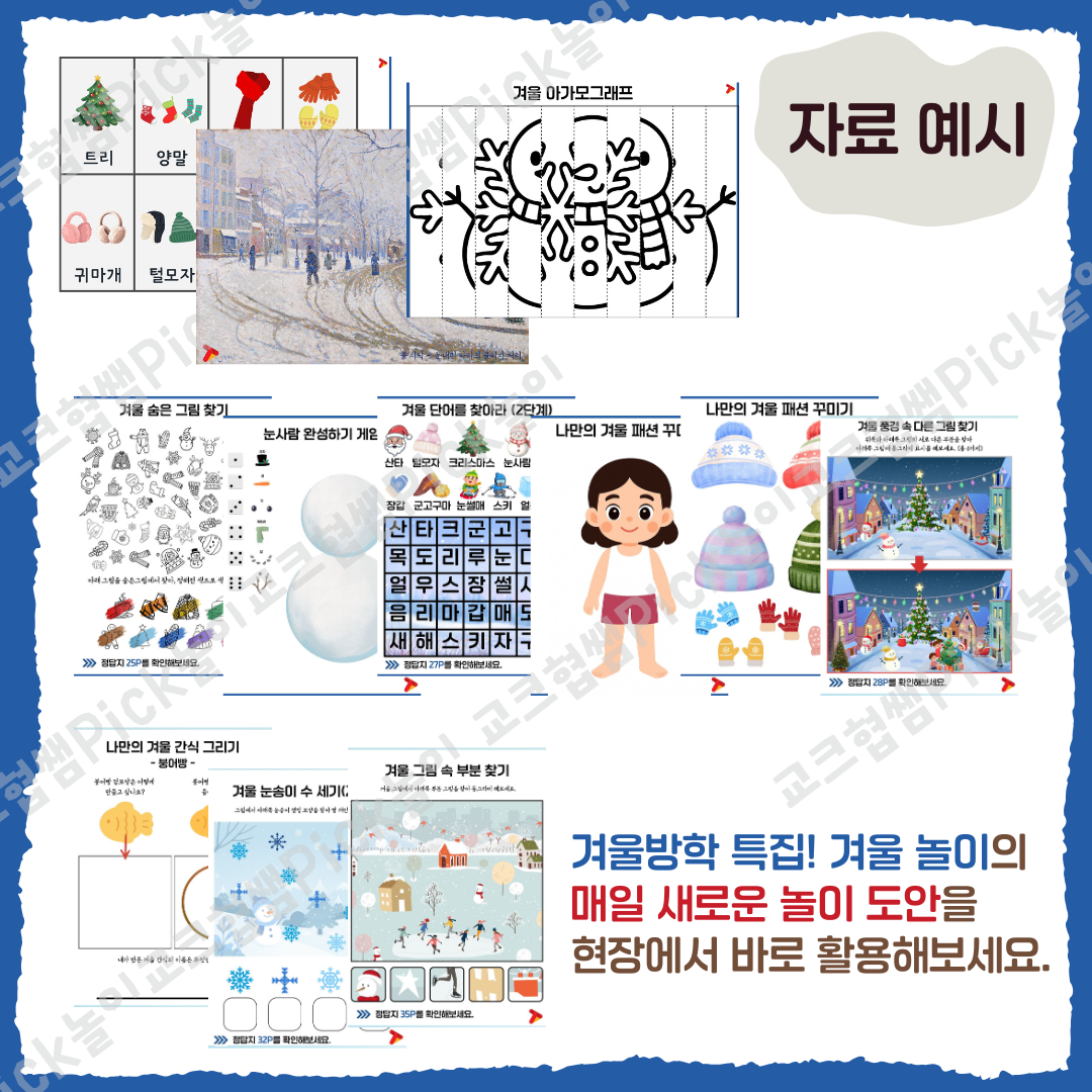 1~2월 겨울방학 특집! 스무날의 겨울 놀이자료가 담겨있습니다. 쌤픽놀이는 어린이집과 유치원, 초등 저학년까지 활용 가능합니다.