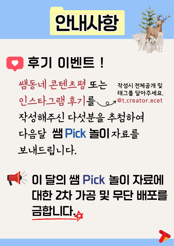 겨울을 주제로 한 놀이수업을 교사가 운영할 때나 겨울방학 시 가정 연계 놀이로 학부모에게 안내할 수 있습니다. 인스타그램(작성시 전체공개 및 태그입력 @t.creator.ecet) 또는 쌤동네 콘텐츠평을 써주시면 추첨을 통해 다음 호를 무료로 보내드리는 이벤트도 진행중입니다. 많은 참여 부탁드리며, 현장에서 유용하게 활용해보시기 바랍니다.