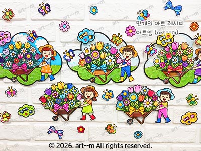 C 세트는 꽃수레와 함께 자유롭게 꾸밀 수 있는 구름 배경으로 구성되어 있습니다. D 세트는 구름 배경 없이 꽃수레와 배경 장식으로 이루어진 도안입니다. 가위질 없이 색칠 활동할 때 활용하기 좋으며, 꽃수레만 오려서 다양한 교실 환경꾸미기에 활용해도 좋아요.