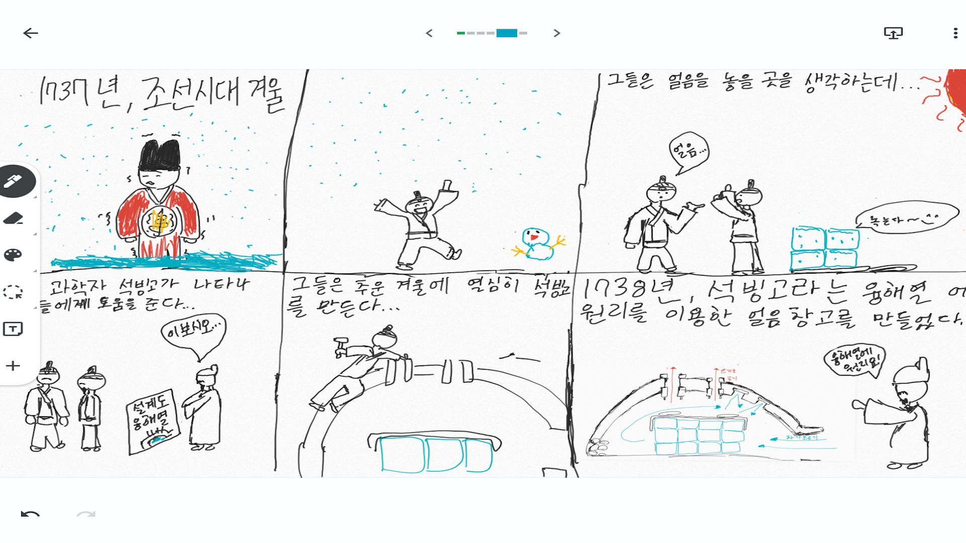 수업시간엔 학생들끼리 토의나 함께 작품 만들기, 콘티 그리기, 자료 정리 등