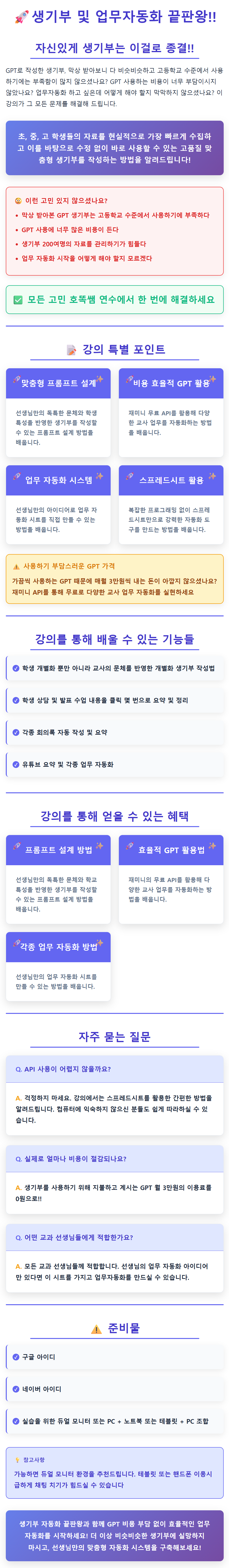 생기부 및 업무 자동화 끝판왕(ver3.0)!! 지금까진 시간관계로 인해 소개 하지 못했던 모든 기능을 싹다 모았습니다. 시간도 여유롭게 6시간으로 잡아 기존에 전달해드리지 못했던 내용과 중간 중간 호똑쌤이 직접 만든 각종 프로그램도 공유해 절대 시간과 비용이 아깝지 않도록 준비했습니다. 기존에 스캔 버전 혹은 GPT 버전을 수강 하신 분들은 꼭 중복 수강하실 필요 없으십니다. 다만 몇가지 기능이 추가 됐으니 참고해주세요 ^^