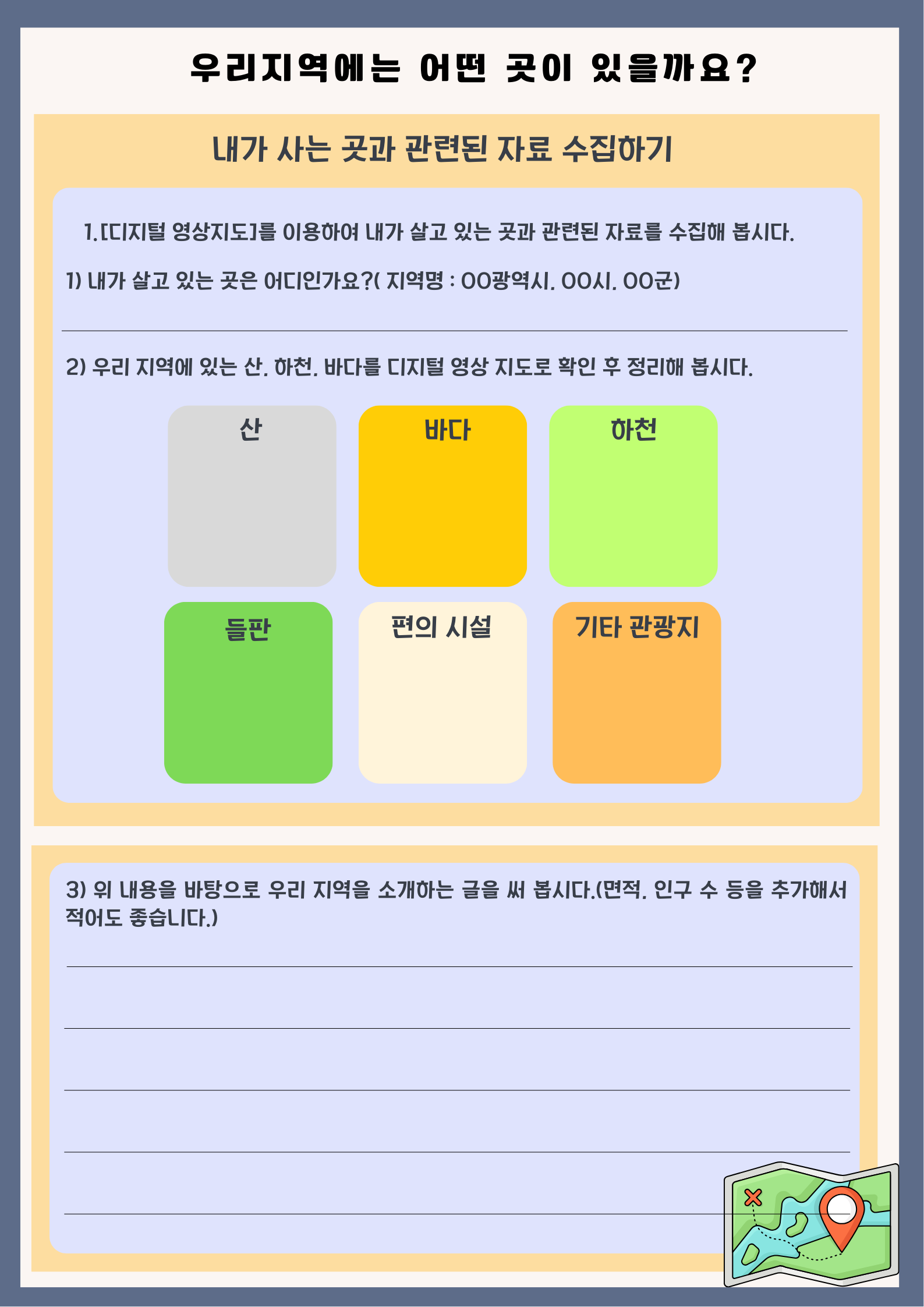 ๐ก ์ฐ๋ฆฌ ์ง์ญ์ ๋ํ ์ดํด: ๋ด๊ฐ ์ด๊ณ ์๋ ์ง์ญ์ ์์ฐํ๊ฒฝ๊ณผ ์์ค๋ค์ ์ง์ ํ์ํ๋ฉฐ ์ง์ญ์ ๋ํ ์ ์ฐฉ๊ณผ ์ดํด๋๊ฐ ๋์์ ธ์!
