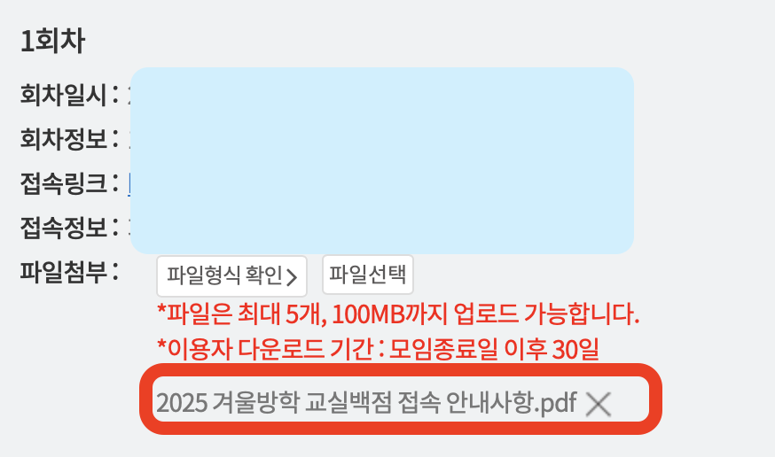 해당 모임 정보 영역에 첨부파일 클릭 후 다운 가능