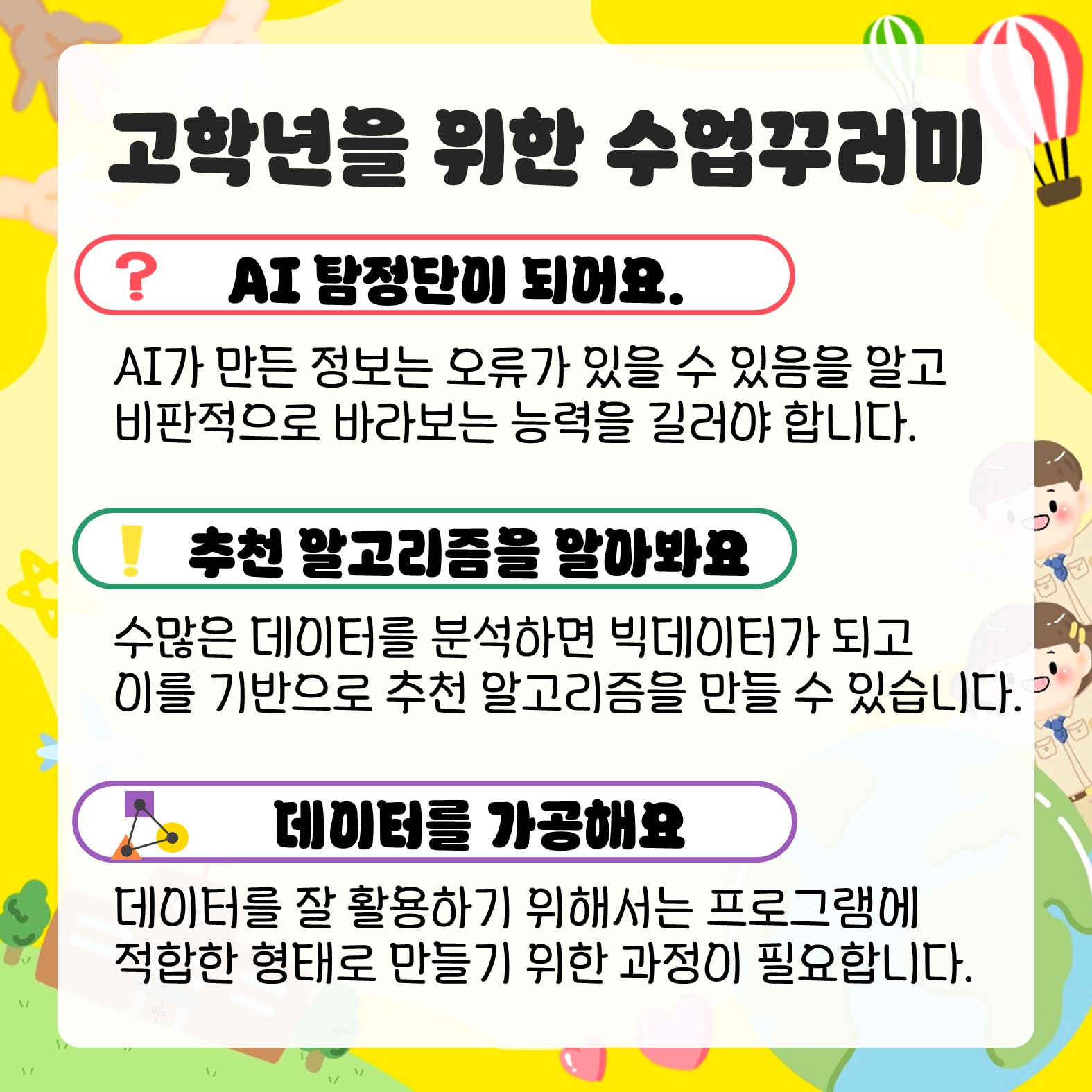 학생들이 인공지능을 이해하고, 비판적으로 바라보고, 데이터를 활용해보는 수업을 하고싶은 선생님!