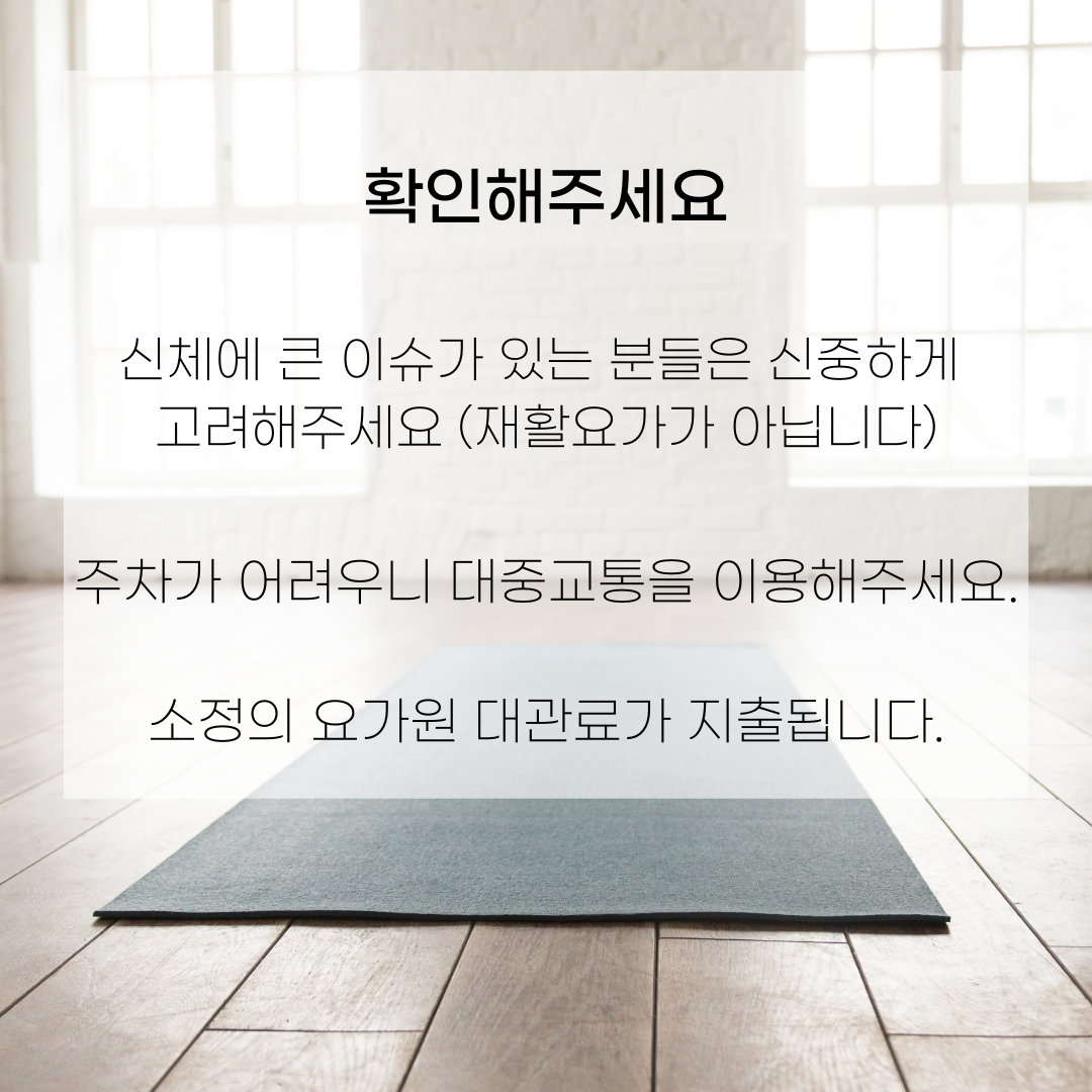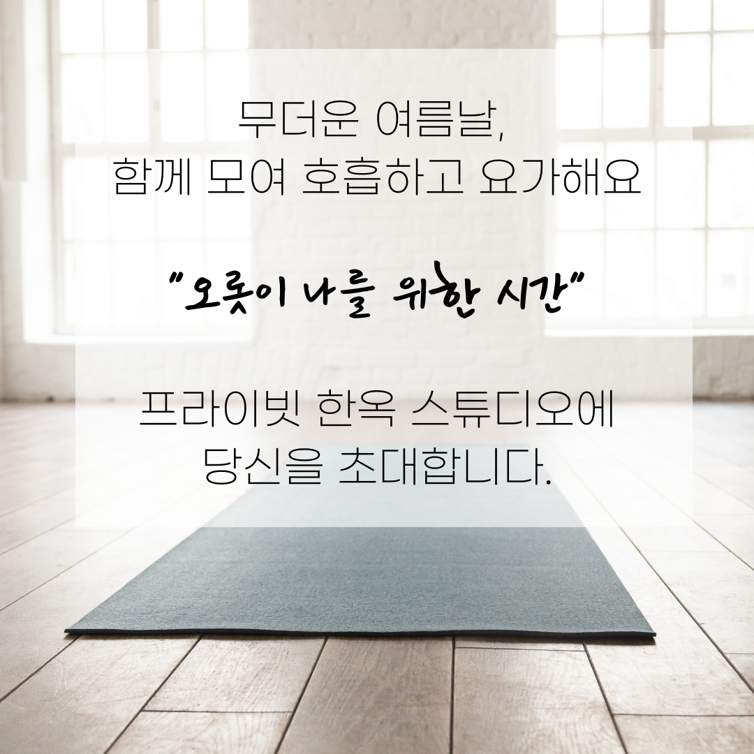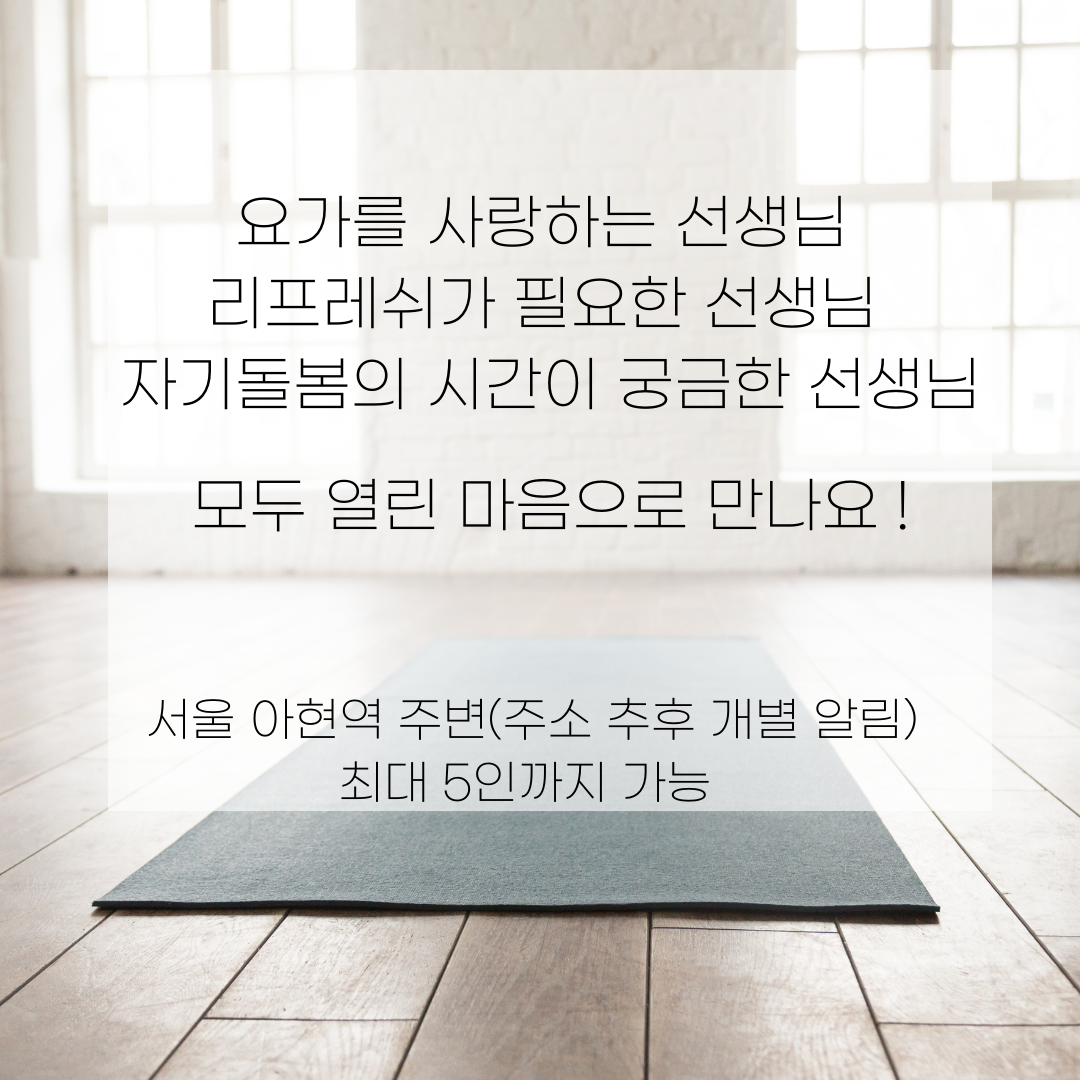 🧘‍♀️선생님을 위한 요가나눔입니다 🧘‍♀️ (3회차) 무더운 여름, 함께 모여 호흡하고 요가해요 최대 5인, 프라이빗한 한옥 스튜디오에서 진행합니다. (서울 아현역 주변, 장소는 추후 개별 안내) 🔸 요가를 사랑하는 선생님 🔸 리프레쉬가 필요한 선생님 🔸 자기돌봄의 시간이 궁금한 선생님 모두 환영합니다 ! 📍 본 연수는 자율연수로 직무연수 시간이 인정되지 않습니다. 📍 원활한 진행을 위해, 10분 전에 입실 바랍니다.