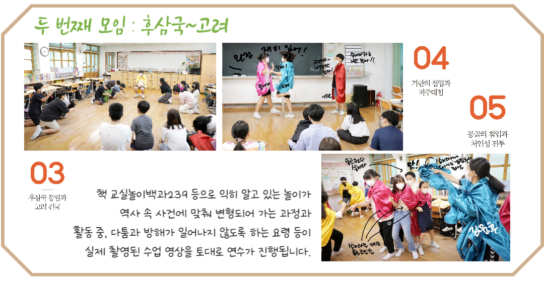 교과서의 정보를 눈으로만 배우고 익히는 것이 아니라, 간단한 ‘놀이’와 ‘연극’을 통해 몸을 움직여 역사의 현장으로 들어가고 당시의 사건을 직접 재연합니다.