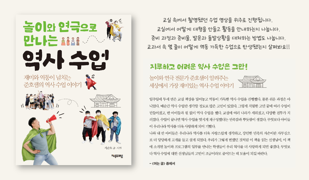 교사가 가르치기 까다로운 과목 중 하나가 바로 역사 수업입니다. 짧은 시수와 수업 시간 내에 방대한 내용을 배우고 가르쳐야 하는 초등학교 역사 수업은 학생이나 교사 모두에게 적지 않은 부담이지요. 그럼에도 불구하고 단순히 역사적 사실을 알려주는 강좌나 연수는 많지만, 정작 아이들에게 역사를 어떻게 가르치면 좋을지에 대한 교수법은 흔치 않습니다.