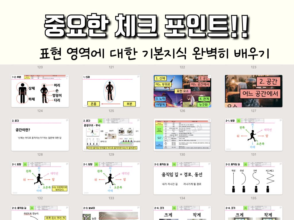 기본 움직임 기술(이동, 비이동, 조작)과 움직임 요소(신체, 공간, 노력, 관계)에 대해 알고, 이것들을 어떻게 지도하면 재밌고 의미있게 지도할지 알려드립니다.