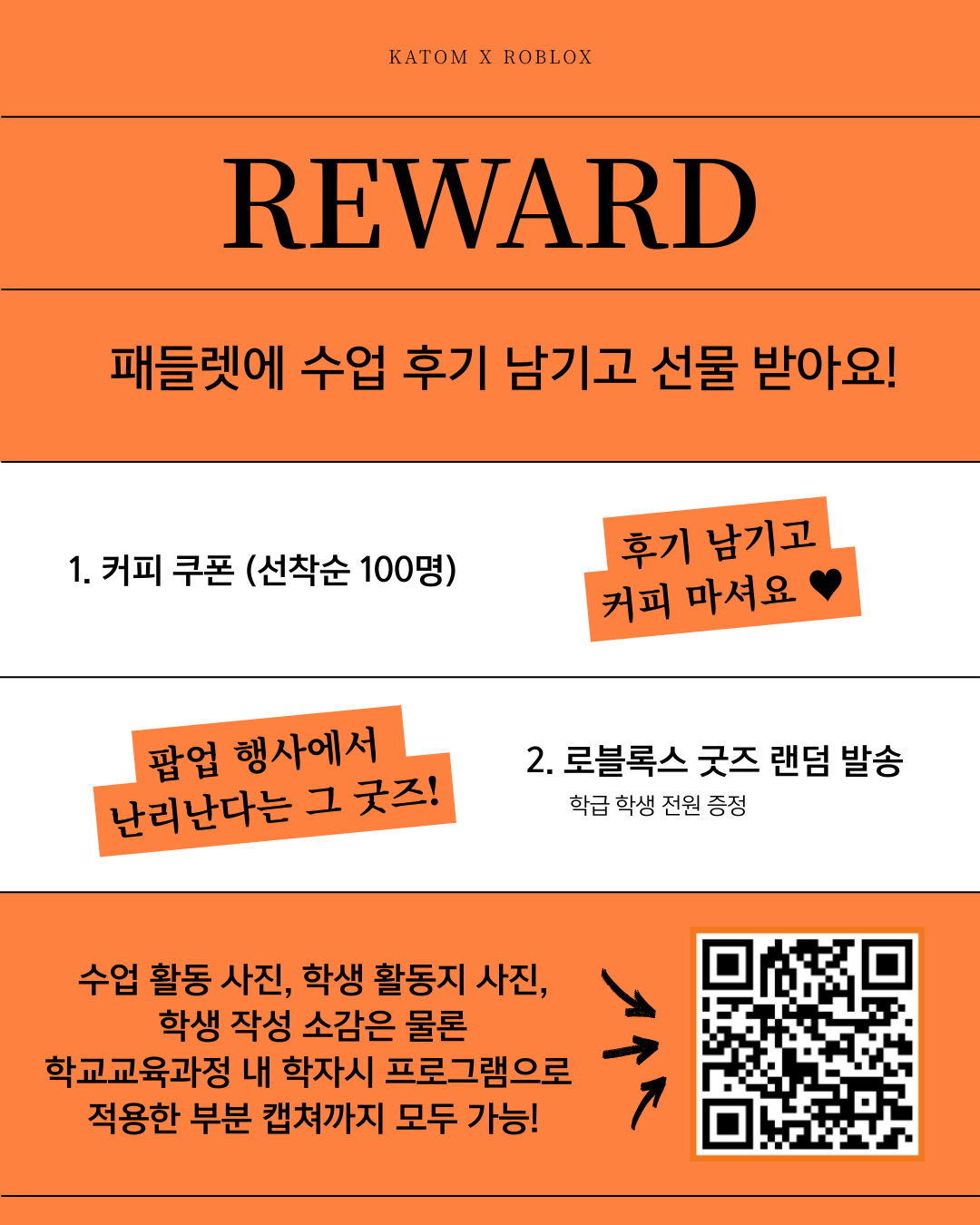 우수 후기를 선정하여 학급 전체에 로블록스 랜덤 굿즈를 드려요.